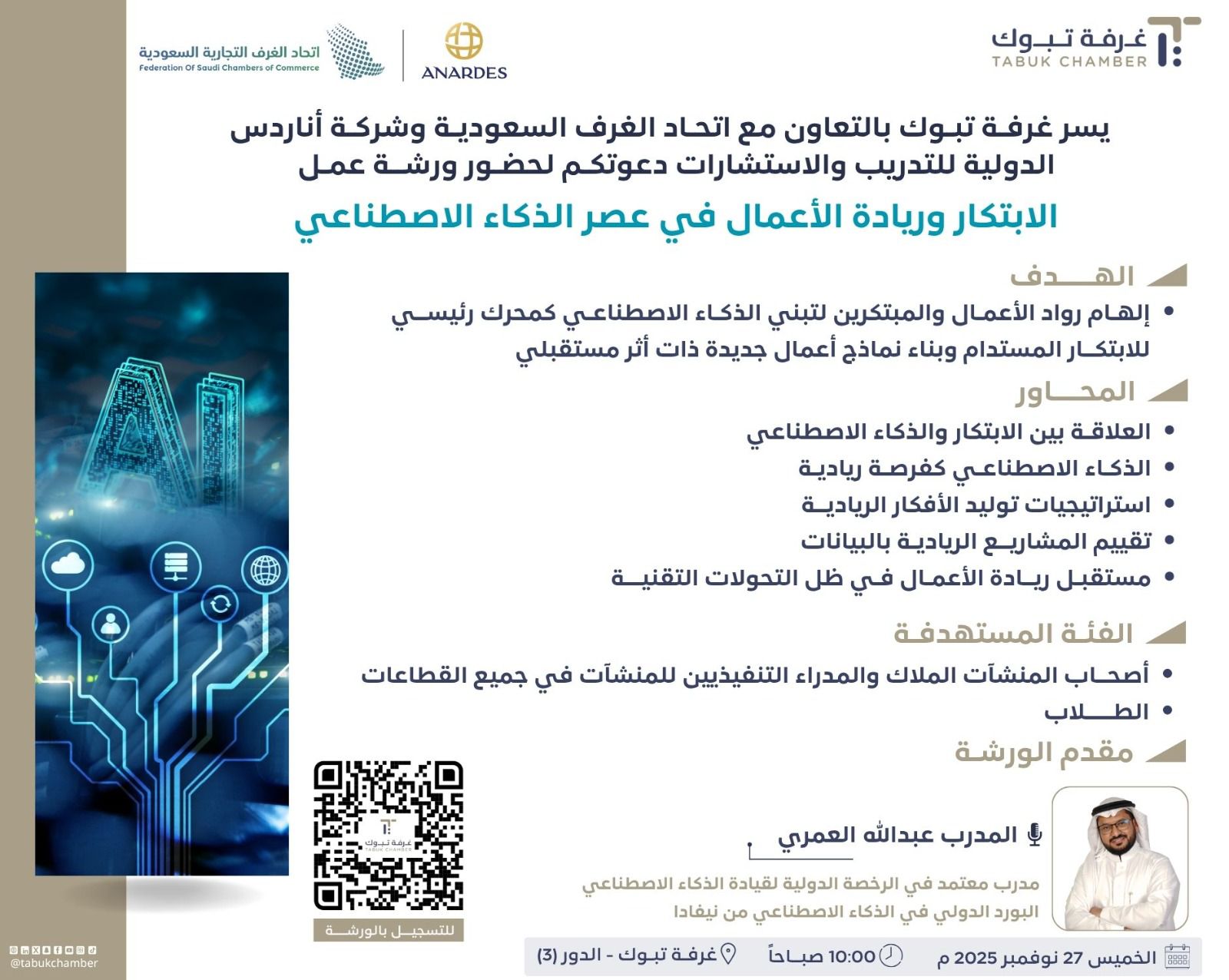 تهديكم غرفة تبوك أطيب تحياتها، وتفيدكم بتلقيها خطاب اتحاد الغرف السعودية رقم (45539706) وتاريخ (1447/05/27هـ)، والمشار فيه إلى إشارة إلى خطاب الغرفة الإسلامية للتجارة والتنمية رقم (51MEM-0497) بتاريخ 10 نوفمبر 2025م، بشأن عقد منتدى مكة لريادة الأعمال تحت شعار “تمكين ريادة الأعمال من أجل مستقبل مستدام " خلال يومي 26 و 27 نوفمبر 2025م في مكة المكرمة تحت رعاية صاحب السمو الملكي الأمير سعود بن مشعل بن عبد العزيز آل سعود نائب أمير منطقة مكة المكرمة وتنظيم كلا من منظمة صالح كامل لريادة الأعمال المستدامة وتنمية المشروعات والغرفة التجارية بمكة المكرمة، وذلك في إطار مبادرة منافع وبما يتوافق مع رؤية المملكة 2030 ، حيث يستعرض المنتدى فرص الابتكار وريادة الاعمال المستدامة مع التركيز على الاستثمار الحلال والتكنولوجيا الحديثة ، كما يوفر المنتدى منصة للتواصل الدولي وتبادل الخبرات بين رواد الاعمال والمستثمرين مع تسليط الضوء على قصص النجاح. عليه، للمهتمين والراغبين بالمشاركة في هذا المنتدى يمكنكم التسجيل من خلال المسح على رمز الاستجابة السريع (QR).