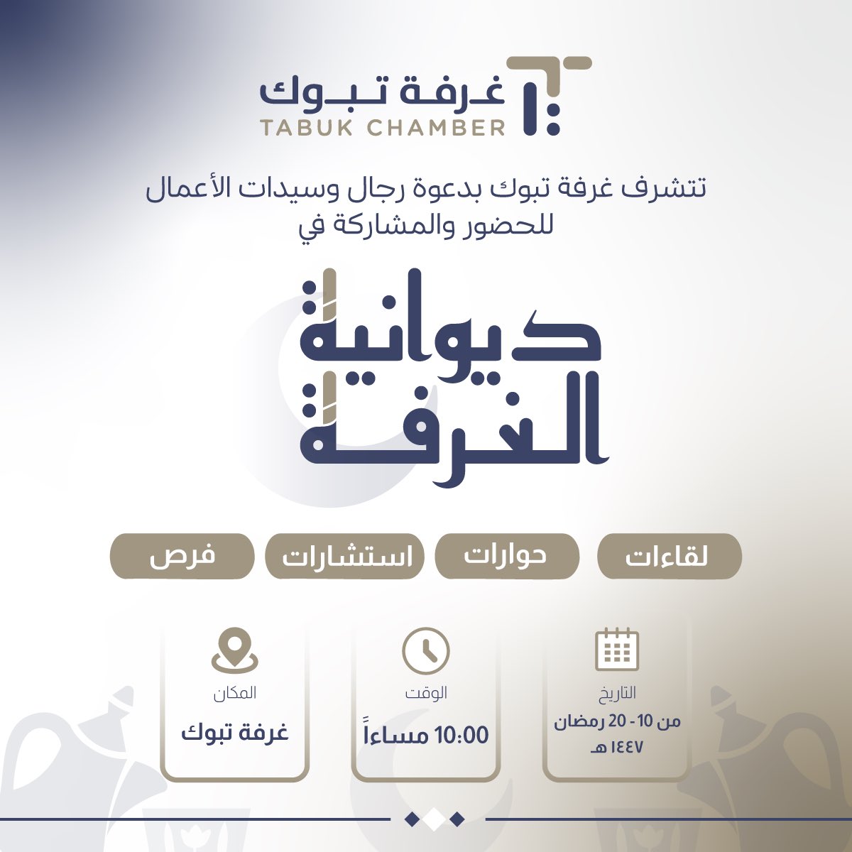 #تبوك تستقبل موسمًا جديدًا من الحوار وصناعة الفرص… #ديوانية_غرفة_تبوك تعود في موسمها الثاني بجلسات اقتصادية ثرية تجمع رجال وسيدات الأعمال، وتفتح آفاقًا جديدة للنقاش والتعاون والاستثمار. مرحبًا بكم في ديوانية غرفة تبوك حيث يلتقي مجتمع الأعمال لتبادل الخبرات وبناء الشراكات وتعزيز الفرص. https://tabukchamber.porsline.com/s/3bN43yUj