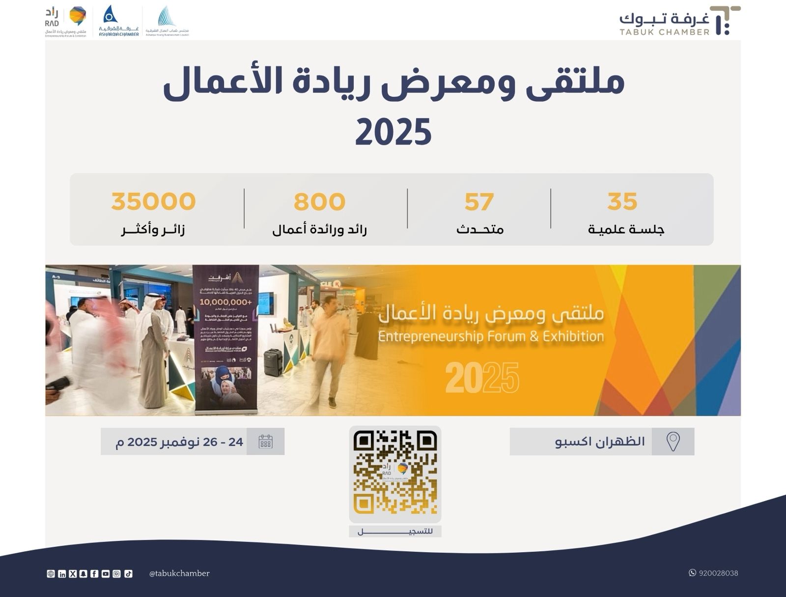 تدعوكم #غرفة_تبوك للمشاركة في #القمة_الدولية_للمعارض_والمؤتمرات 2025 ✨منصة عالمية تجمع أكثر من ٣٠٠٠ من قادة وخبراء قطاع المعارض والمؤتمرات وفعاليات الأعمال حول العالم ✨شراكة القطاعين العام والخاص كمحرك رئيسي لنمو قطاع المعارض والمؤتمرات وفعاليات الأعمال 🗓 26 - 27 نوفمبر 2025م 📍 الرياض - ذا كانوبي للتسجيل 🔗 https://internationalmicesummit.com/ar #غرفة_تبوك