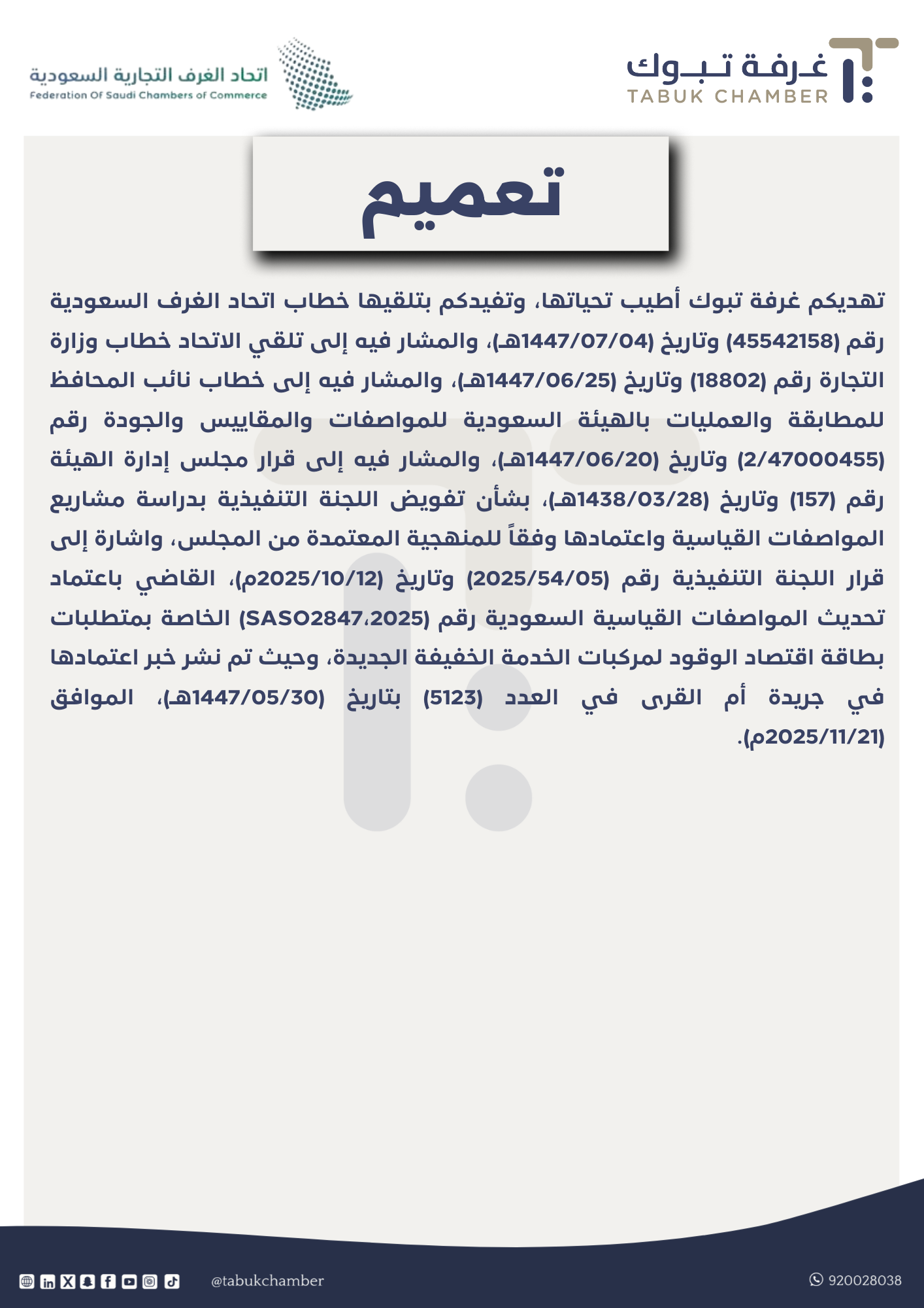 تهديكم غرفة تبوك أطيب تحياتها، وتفيدكم بتلقيها خطاب اتحاد الغرف السعودية رقم (45542158) وتاريخ (1447/07/04هـ)، والمشار فيه إلى تلقي الاتحاد خطاب وزارة التجارة رقم (18802) وتاريخ (1447/06/25هـ)، والمشار فيه إلى خطاب نائب المحافظ للمطابقة والعمليات بالهيئة السعودية للمواصفات والمقاييس والجودة رقم (2/47000455) وتاريخ (1447/06/20هـ)، والمشار فيه إلى قرار مجلس إدارة الهيئة رقم (157) وتاريخ (1438/03/28هـ)، بشأن تفويض اللجنة التنفيذية بدراسة مشاريع المواصفات القياسية واعتمادها وفقاً للمنهجية المعتمدة من المجلس، واشارة إلى قرار اللجنة التنفيذية رقم (2025/54/05) وتاريخ (2025/10/12م)، القاضي باعتماد تحديث المواصفات القياسية السعودية رقم (SASO2847،2025) الخاصة بمتطلبات بطاقة اقتصاد الوقود لمركبات الخدمة الخفيفة الجديدة، وحيث تم نشر خبر اعتمادها في جريدة أم القرى في العدد (5123) بتاريخ (1447/05/30هـ)، الموافق (2025/11/21م).