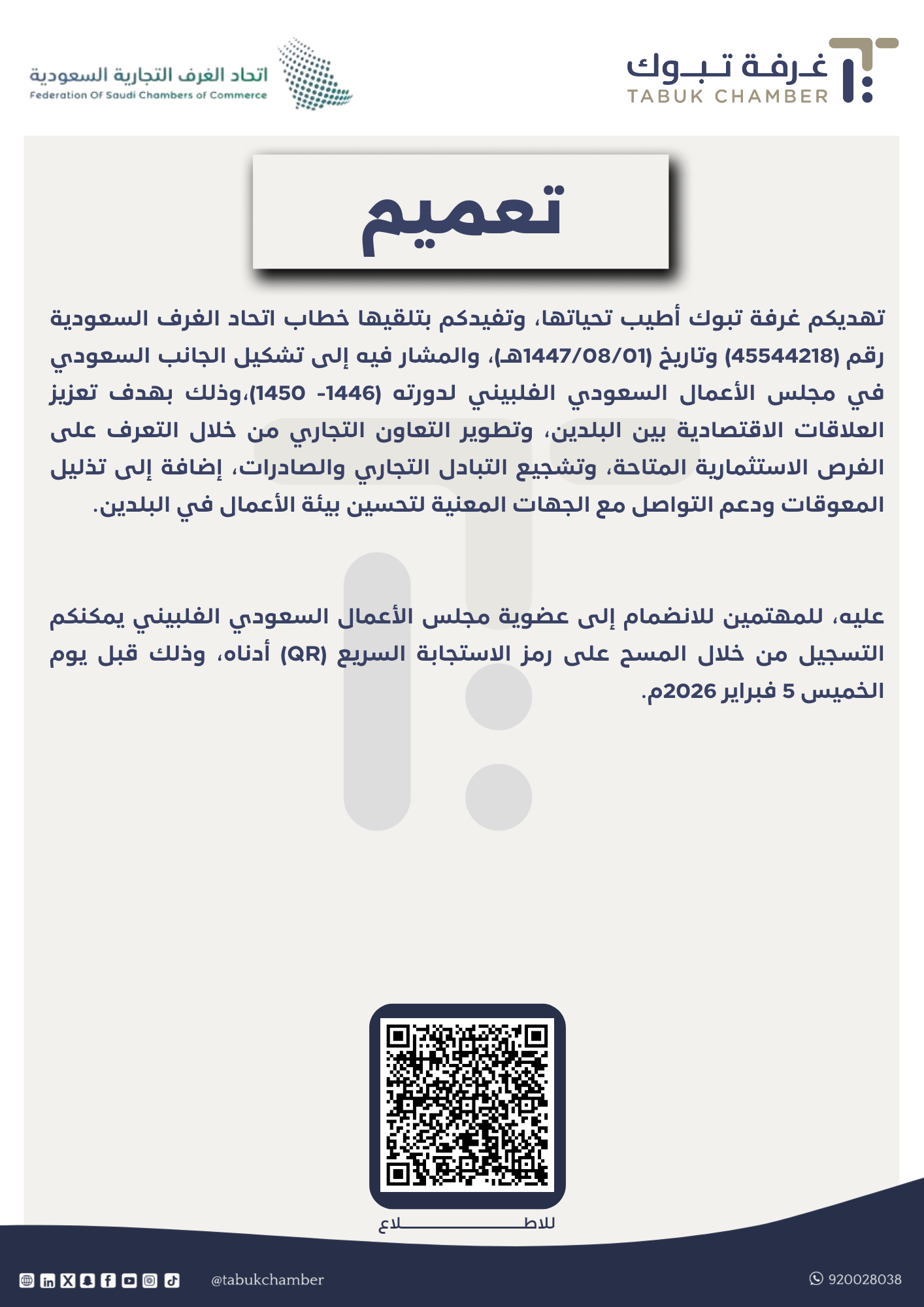 تهديكم غرفة تبوك أطيب تحياتها، وتفيدكم بتلقيها خطاب اتحاد الغرف السعودية رقم (45544218) وتاريخ (1447/08/01هـ)، والمشار فيه إلى تشكيل الجانب السعودي في مجلس الأعمال السعودي الفلبيني لدورته (1446- 1450)،وذلك بهدف تعزيز العلاقات الاقتصادية بين البلدين، وتطوير التعاون التجاري من خلال التعرف على الفرص الاستثمارية المتاحة، وتشجيع التبادل التجاري والصادرات، إضافة إلى تذليل المعوقات ودعم التواصل مع الجهات المعنية لتحسين بيئة الأعمال في البلدين. عليه، للمهتمين للإنضمام إلى عضوية مجلس الأعمال السعودي الفلبيني يمكنكم التسجيل من خلال المسح على رمز الاستجابة السريع (QR) أدناه، وذلك قبل يوم الخميس 5 فبراير 2026م.