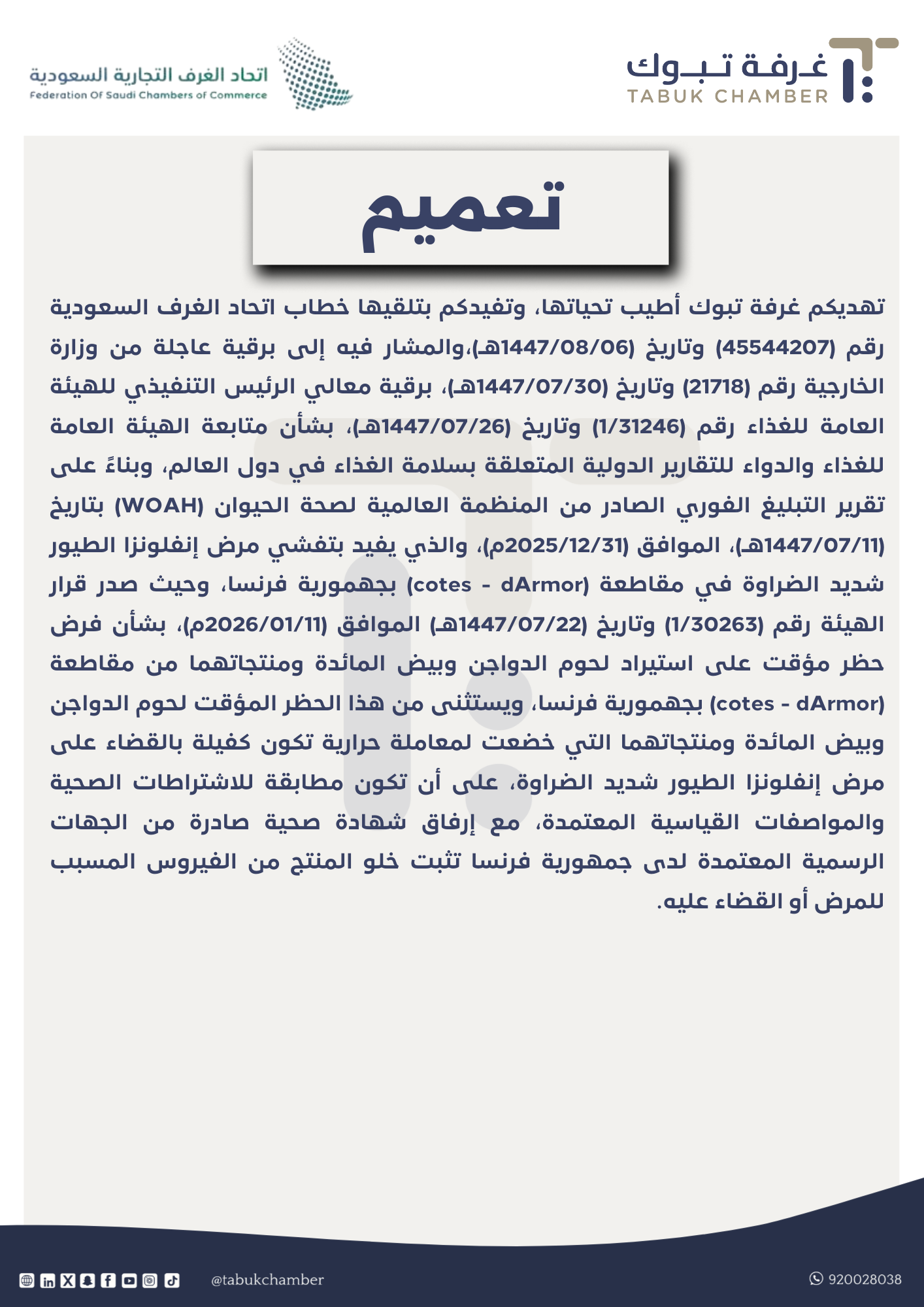 تهديكم غرفة تبوك أطيب تحياتها، وتفيدكم بتلقيها خطاب اتحاد الغرف السعودية رقم (45544207) وتاريخ (1447/08/06هـ)،والمشار فيه إلى برقية عاجلة من وزارة الخارجية رقم (21718) وتاريخ (1447/07/30هـ)، برقية معالي الرئيس التنفيذي للهيئة العامة للغذاء رقم (1/31246) وتاريخ (1447/07/26هـ)، بشأن متابعة الهيئة العامة للغذاء والدواء للتقارير الدولية المتعلقة بسلامة الغذاء في دول العالم، وبناءً على تقرير التبليغ الفوري الصادر من المنظمة العالمية لصحة الحيوان (WOAH) بتاريخ (1447/07/11هـ)، الموافق (2025/12/31م)، والذي يفيد بتفشي مرض إنفلونزا الطيور شديد الضراوة في مقاطعة (cotes - dArmor) بجهمورية فرنسا، وحيث صدر قرار الهيئة رقم (1/30263) وتاريخ (1447/07/22هـ) الموافق (2026/01/11م)، بشأن فرض حظر مؤقت على استيراد لحوم الدواجن وبيض المائدة ومنتجاتهما من مقاطعة (cotes - dArmor) بجهمورية فرنسا، ويستثنى من هذا الحظر المؤقت لحوم الدواجن وبيض المائدة ومنتجاتهما التي خضعت لمعاملة حرارية تكون كفيلة بالقضاء على مرض إنفلونزا الطيور شديد الضراوة، على أن تكون مطابقة للاشتراطات الصحية والمواصفات القياسية المعتمدة، مع إرفاق شهادة صحية صادرة من الجهات الرسمية المعتمدة لدى جمهورية فرنسا تثبت خلو المنتج من الفيروس المسبب للمرض أو القضاء عليه.