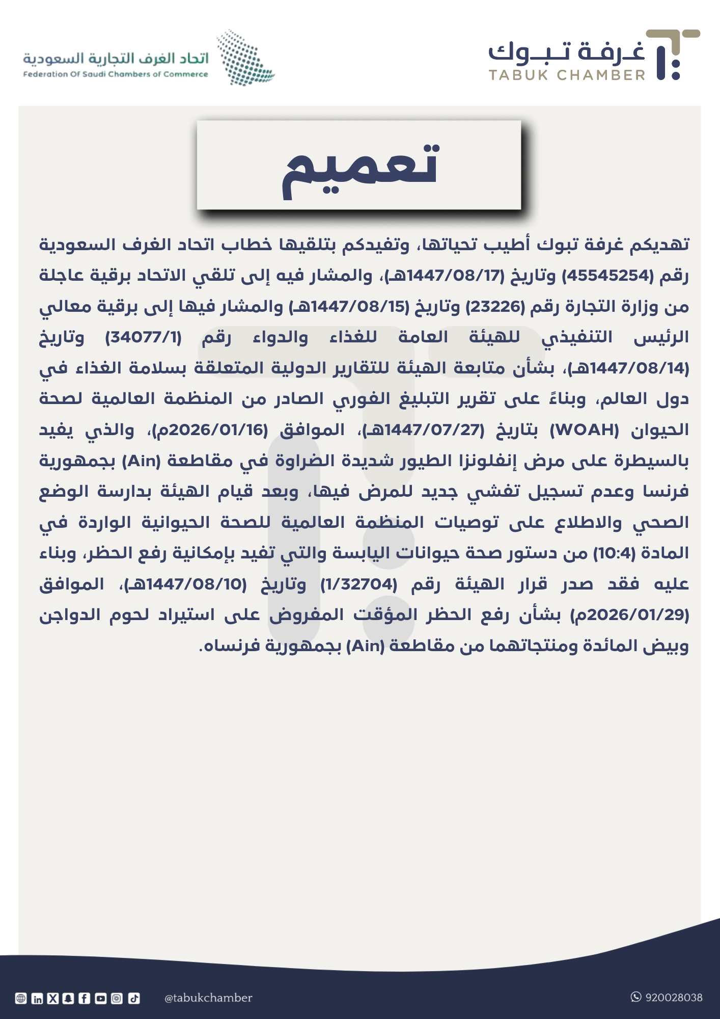 تهديكم غرفة تبوك أطيب تحياتها، وتفيدكم بتلقيها خطاب اتحاد الغرف السعودية رقم (45545254) وتاريخ (1447/08/17هـ)، والمشار فيه إلى تلقي الاتحاد برقية عاجلة من وزارة التجارة رقم (23226) وتاريخ (1447/08/15هـ) والمشار فيها إلى برقية معالي الرئيس التنفيذي للهيئة العامة للغذاء والدواء رقم (34077/1) وتاريخ (1447/08/14هـ)، بشأن متابعة الهيئة للتقارير الدولية المتعلقة بسلامة الغذاء في دول العالم، وبناءً على تقرير التبليغ الفوري الصادر من المنظمة العالمية لصحة الحيوان (WOAH) بتاريخ (1447/07/27هـ)، الموافق (2026/01/16م)، والذي يفيد بالسيطرة على مرض إنفلونزا الطيور شديدة الضراوة في مقاطعة (Ain) بجمهورية فرنسا وعدم تسجيل تفشي جديد للمرض فيها، وبعد قيام الهيئة بدارسة الوضع الصحي والاطلاع على توصيات المنظمة العالمية للصحة الحيوانية الواردة في المادة (10:4) من دستور صحة حيوانات اليابسة والتي تفيد بإمكانية رفع الحظر، وبناء عليه فقد صدر قرار الهيئة رقم (1/32704) وتاريخ (1447/08/10هـ)، الموافق (2026/01/29م) بشأن رفع الحظر المؤقت المفروض على استيراد لحوم الدواجن وبيض المائدة ومنتجاتهما من مقاطعة (Ain) بجمهورية فرنسا.