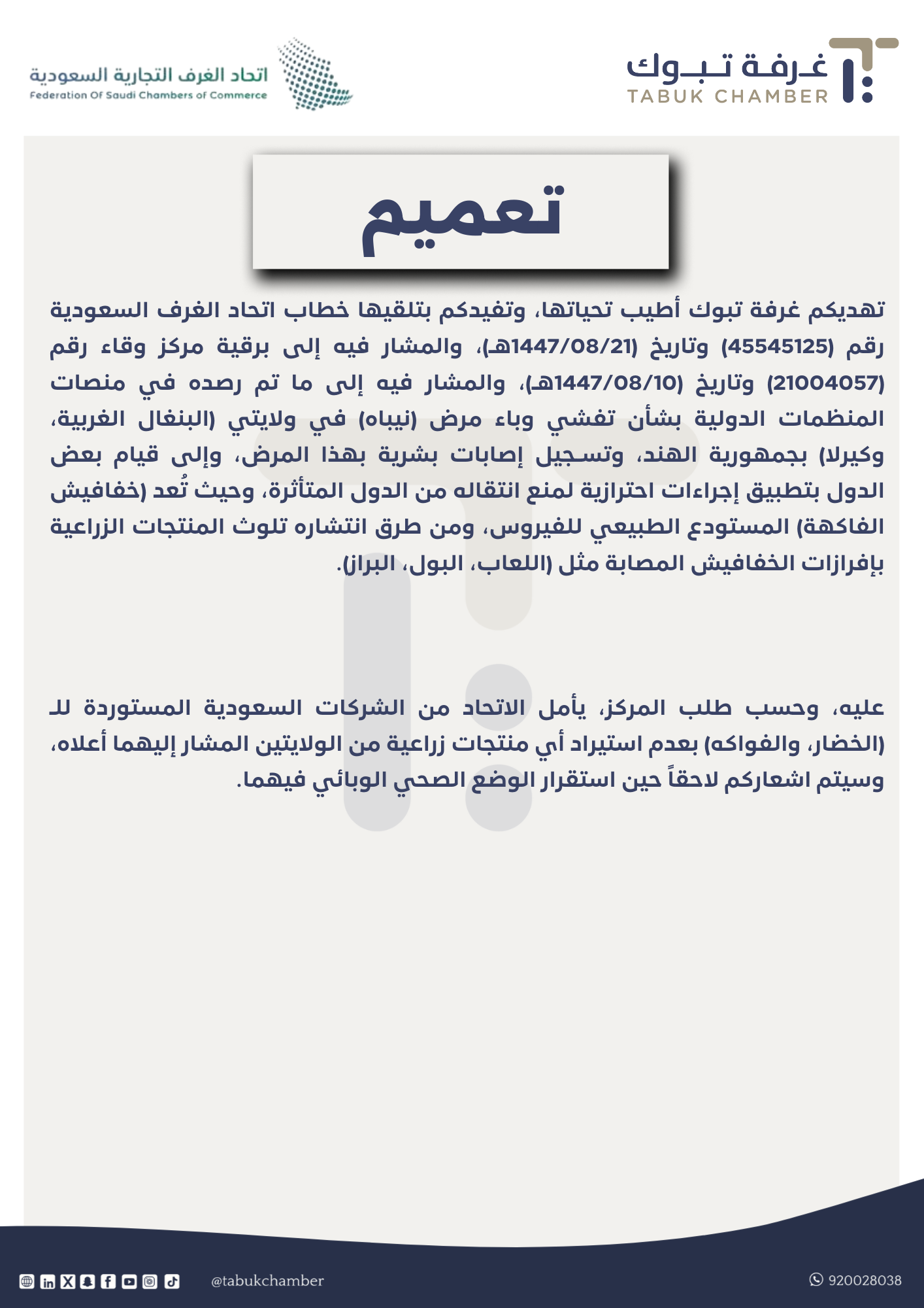 تهديكم غرفة تبوك أطيب تحياتها، وتفيدكم بتلقيها خطاب اتحاد الغرف السعودية رقم (45545125) وتاريخ (1447/08/21هـ)، والمشار فيه إلى برقية مركز وقاء رقم (21004057) وتاريخ (1447/08/10هـ)، والمشار فيه إلى ما تم رصده في منصات المنظمات الدولية بشأن تفشي وباء مرض (نيباه) في ولايتي (البنغال الغربية، وكيرلا) بجمهورية الهند، وتسـجيل إصابات بشرية بهذا المرض، وإلى قيام بعض الدول بتطبيق إجراءات احترازية لمنع انتقاله من الدول المتأثرة، وحيث تُعد (خفافيش الفاكهة) المستودع الطبيعي للفيروس، ومن طرق انتشاره تلوث المنتجات الزراعية بإفرازات الخفافيش المصابة مثل (اللعاب، البول، البراز). عليه، وحسب طلب المركز، يأمل الاتحاد من الشركات السعودية المستوردة للـ (الخضار، والفواكه) بعدم استيراد أي منتجات زراعية من الولايتين المشار إليهما أعلاه، وسيتم اشعاركم لاحقاً حين استقرار الوضع الصحي الوبائي فيهما.