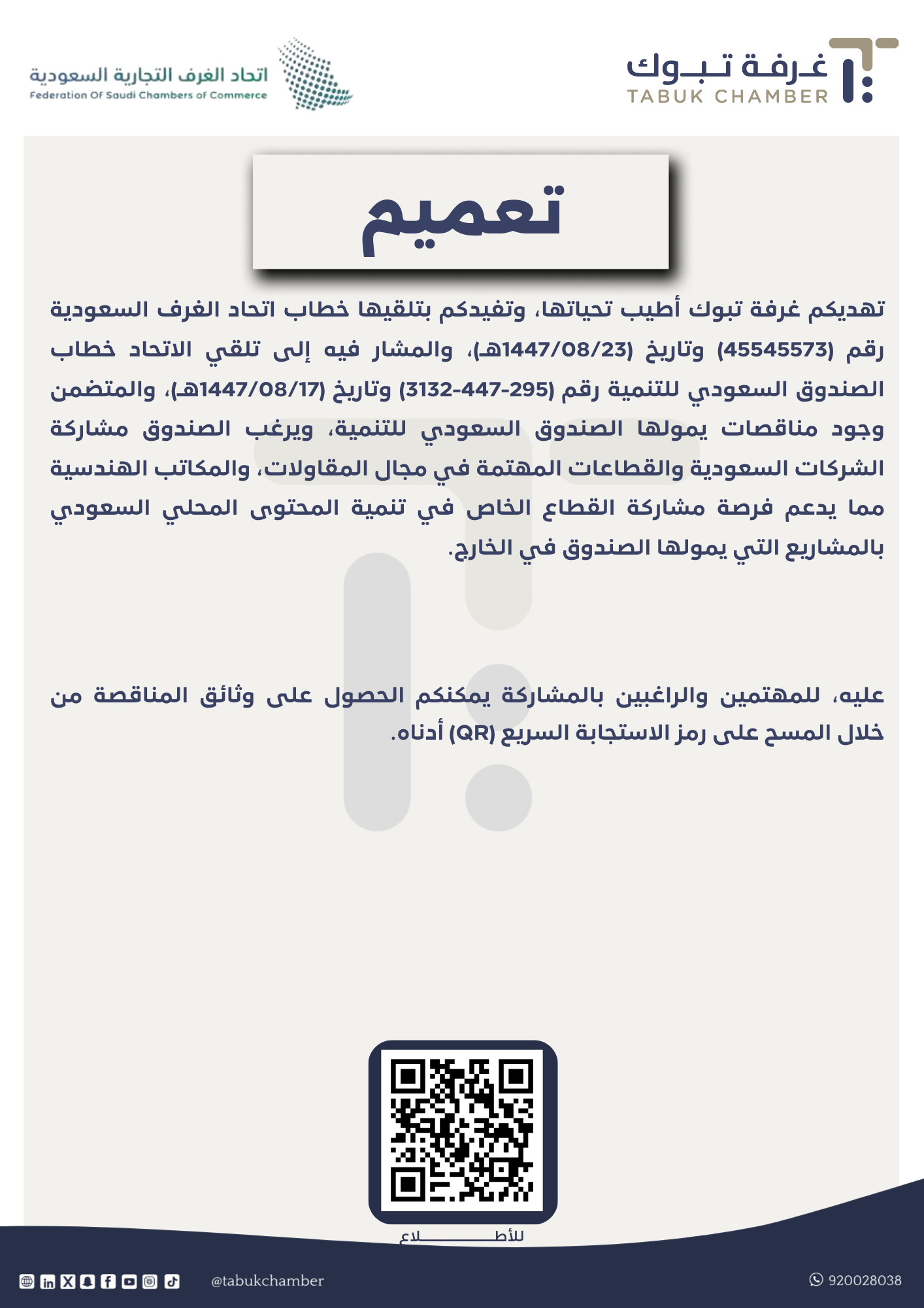 تهديكم غرفة تبوك أطيب تحياتها، وتفيدكم بتلقيها خطاب اتحاد الغرف السعودية رقم (45545573) وتاريخ (1447/08/23هـ)، والمشار فيه إلى تلقي الاتحاد خطاب الصندوق السعودي للتنمية رقم (295-447-3132) وتاريخ (1447/08/17هـ)، والمتضمن وجود مناقصات يمولها الصندوق السعودي للتنمية، ويرغب الصندوق مشاركة الشركات السعودية والقطاعات المهتمة في مجال المقاولات، والمكاتب الهندسية مما يدعم فرصة مشاركة القطاع الخاص في تنمية المحتوى المحلي السعودي بالمشاريع التي يمولها الصندوق في الخارج. عليه، للمهتمين والراغبين بالمشاركة يمكنكم الحصول على وثائق المناقصة من خلال المسح على رمز الاستجابة السريع (QR) أدناه.