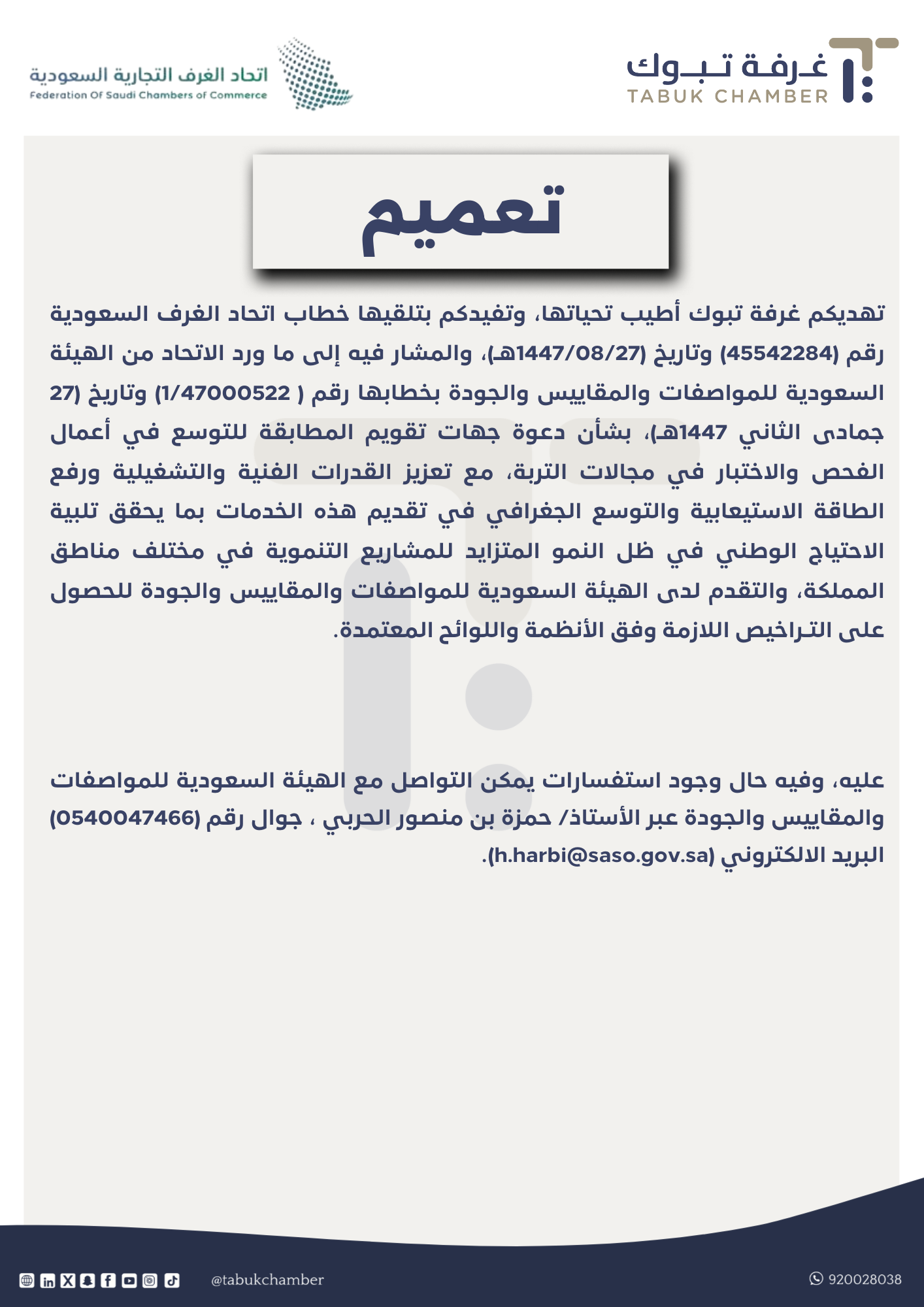تهديكم غرفة تبوك أطيب تحياتها، وتفيدكم بتلقيها خطاب اتحاد الغرف السعودية رقم (45542284) وتاريخ (1447/08/27هـ)، والمشار فيه إلى ما ورد الاتحاد من الهيئة السعودية للمواصفات والمقاييس والجودة بخطابها رقم ( 1/47000522) وتاريخ (27 جمادى الثاني 1447هـ)، بشأن دعوة جهات تقويم المطابقة للتوسع في أعمال الفحص والاختبار في مجالات التربة، مع تعزيز القدرات الفنية والتشغيلية ورفع الطاقة الاستيعابية والتوسع الجغرافي في تقديم هذه الخدمات بما يحقق تلبية الاحتياج الوطني في ظل النمو المتزايد للمشاريع التنموية في مختلف مناطق المملكة، والتقدم لدى الهيئة السعودية للمواصفات والمقاييس والجودة للحصول على التـراخيص اللازمة وفق الأنظمة واللوائح المعتمدة. عليه، وفيه حال وجود استفسارات يمكن التواصل مع الهيئة السعودية للمواصفات والمقاييس والجودة عبر الأستاذ/ حمزة بن منصور الحربي ، جوال رقم (0540047466) البريد الالكتروني (h.harbi@saso.gov.sa).