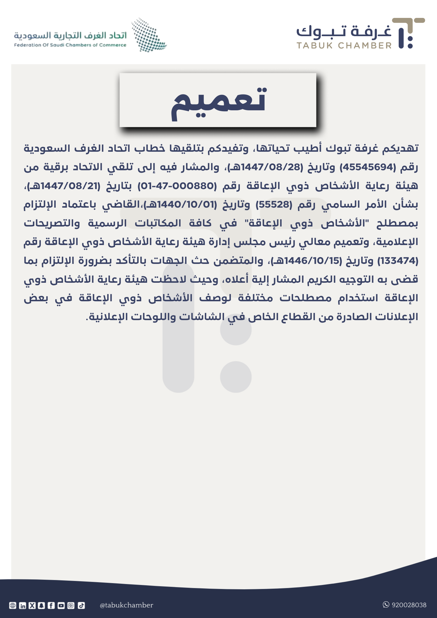 تهديكم غرفة تبوك أطيب تحياتها، وتفيدكم بتلقيها خطاب اتحاد الغرف السعودية رقم (45545694) وتاريخ (1447/08/28هـ)، والمشار فيه إلى تلقي الاتحاد برقية من هيئة رعاية الأشخاص ذوي الإعاقة رقم (000880-47-01) بتاريخ (1447/08/21هـ)، بشأن الأمر السامي رقم (55528) وتاريخ (1440/10/01هـ)،القاضي باعتماد الإلتزام بمصطلح "الأشخاص ذوي الإعاقة" في كافة المكاتبات الرسمية والتصريحات الإعلامية، وتعميم معالي رئيس مجلس إدارة هيئة رعاية الأشخاص ذوي الإعاقة رقم (133474) وتاريخ (1446/10/15هـ)، والمتضمن حث الجهات بالتأكد بضرورة الإلتزام بما قضى به التوجيه الكريم المشار إلية أعلاه، وحيث لاحظت هيئة رعاية الأشخاص ذوي الإعاقة استخدام مصطلحات مختلفة لوصف الأشخاص ذوي الإعاقة في بعض الإعلانات الصادرة من القطاع الخاص في الشاشات واللوحات الإعلانية.