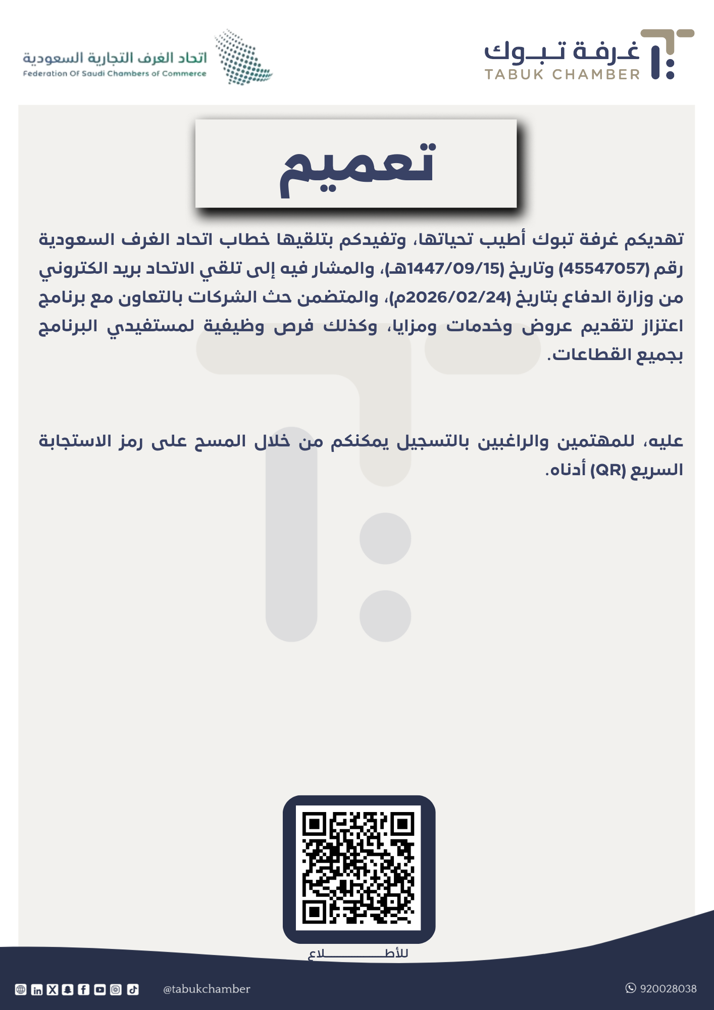 تهديكم غرفة تبوك أطيب تحياتها، وتفيدكم بتلقيها خطاب اتحاد الغرف السعودية رقم (45547057) وتاريخ (1447/09/15هـ)، والمشار فيه إلى تلقي الاتحاد بريد الكتروني من وزارة الدفاع بتاريخ (2026/02/24م)، والمتضمن حث الشركات بالتعاون مع برنامج اعتزاز لتقديم عروض وخدمات ومزايا، وكذلك فرص وظيفية لمستفيدي البرنامج بجميع القطاعات. عليه، للمهتمين والراغبين بالتسجيل يمكنكم من خلال المسح على رمز الاستجابة السريع (QR) أدناه.