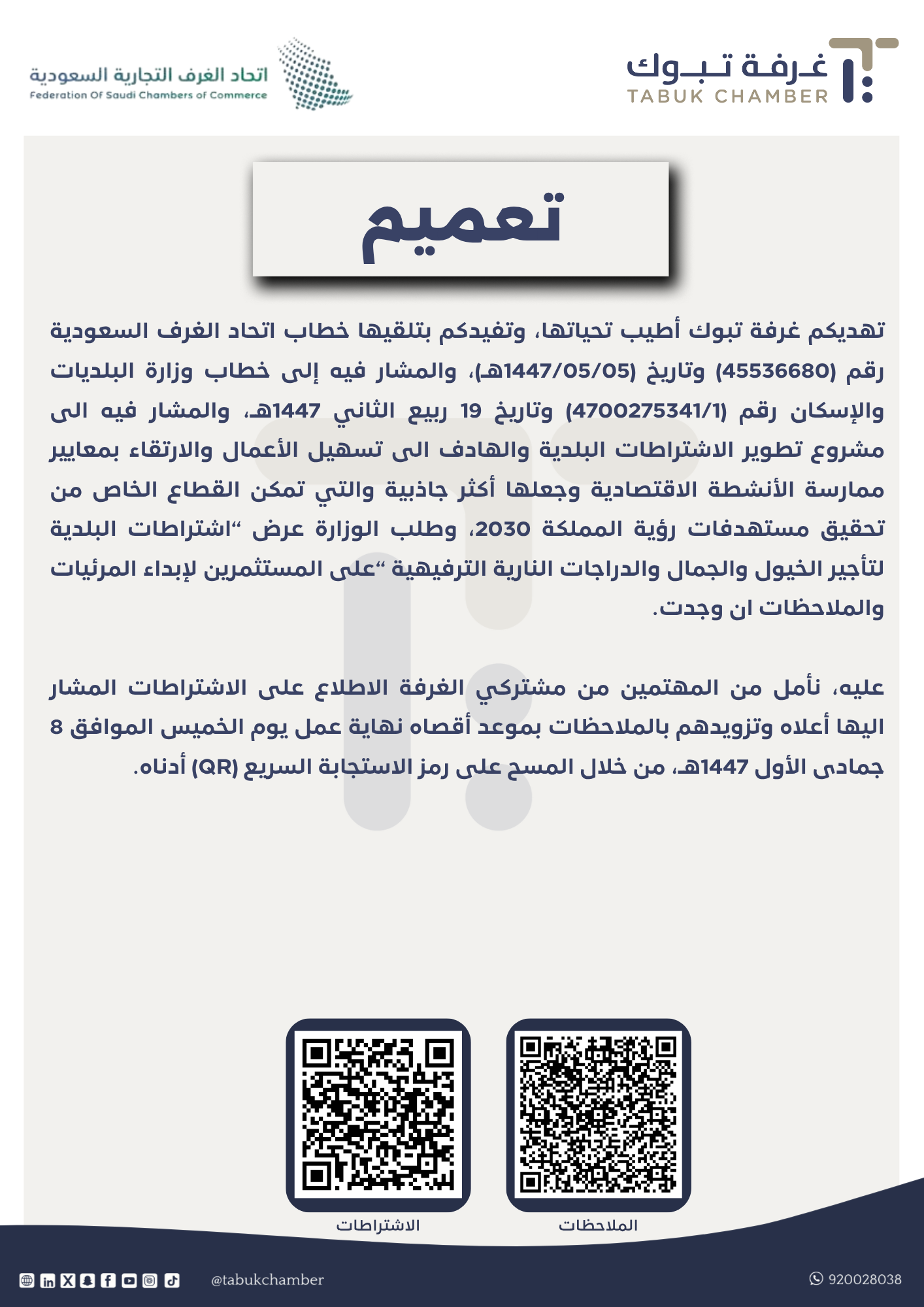 تهديكم غرفة تبوك أطيب تحياتها، وتفيدكم بتلقيها خطاب اتحاد الغرف السعودية رقم (45536680) وتاريخ (1447/05/05هـ)، والمشار فيه إلى خطاب وزارة البلديات والإسكان رقم (4700275341/1) وتاريخ 19 ربيع الثاني 1447هـ، والمشار فيه الى مشروع تطوير الاشتراطات البلدية والهادف الى تسهيل الأعمال والارتقاء بمعايير ممارسة الأنشطة الاقتصادية وجعلها أكثر جاذبية والتي تمكن القطاع الخاص من تحقيق مستهدفات رؤية المملكة 2030، وطلب الوزارة عرض “اشتراطات البلدية لتأجير الخيول والجمال والدراجات النارية الترفيهية “على المستثمرين لإبداء المرئيات والملاحظات ان وجدت. عليه، نأمل من المهتمين من مشتركي الغرفة الاطلاع على الاشتراطات المشار اليها أعلاه وتزويدهم بالملاحظات بموعد أقصاه نهاية عمل يوم الخميس الموافق 8 جمادى الأول 1447هـ، من خلال المسح على رمز الاستجابة السريع (QR) أدناه.