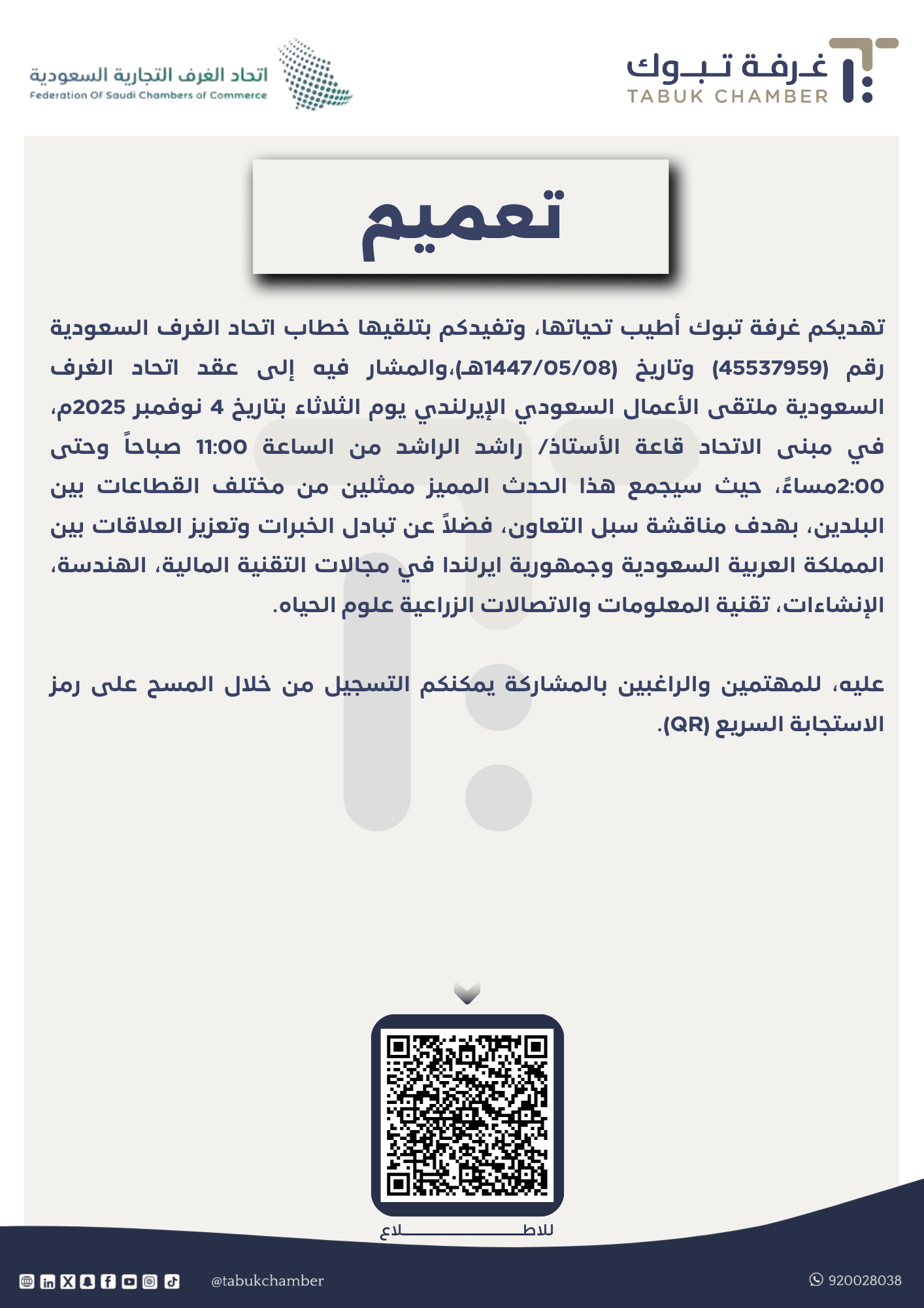 تهديكم غرفة تبوك أطيب تحياتها، وتفيدكم بتلقيها خطاب اتحاد الغرف السعودية رقم (45537959) وتاريخ (1447/05/08هـ)،والمشار فيه إلى عقد اتحاد الغرف السعودية ملتقى الأعمال السعودي الإيرلندي يوم الثلاثاء بتاريخ 4 نوفمبر 2025م، في مبنى الاتحاد قاعة الأستاذ/ راشد الراشد من الساعة 11:00 صباحاً وحتى 2:00مساءً، حيث سيجمع هذا الحدث المميز ممثلين من مختلف القطاعات بين البلدين، بهدف مناقشة سبل التعاون، فضلاً عن تبادل الخبرات وتعزيز العلاقات بين المملكة العربية السعودية وجمهورية ايرلندا في مجالات التقنية المالية، الهندسة، الإنشاءات، تقنية المعلومات والاتصالات الزراعية علوم الحياه. عليه، للمهتمين والراغبين بالمشاركة يمكنكم التسجيل من خلال المسح على رمز الاستجابة السريع (QR).