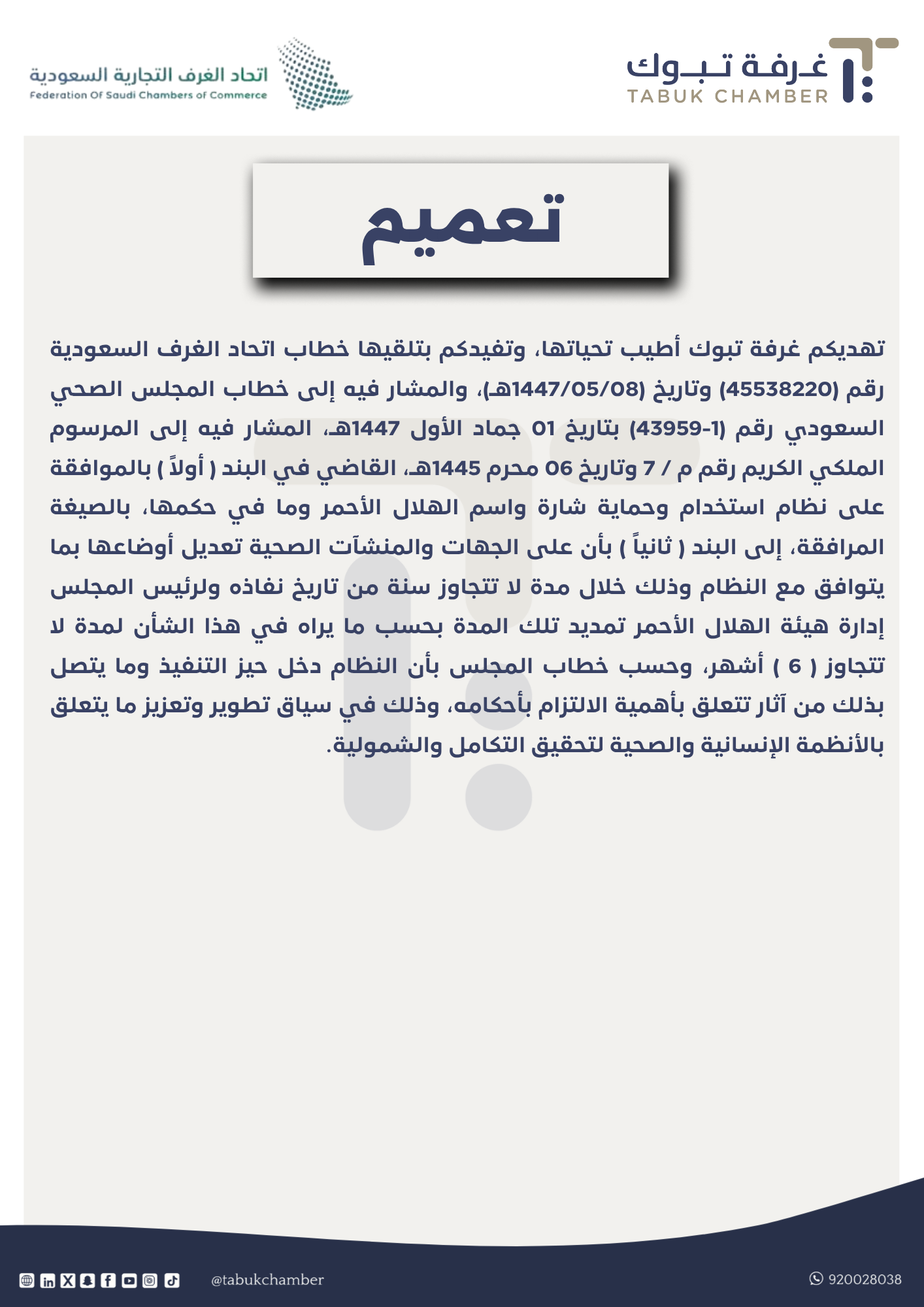تهديكم غرفة تبوك أطيب تحياتها، وتفيدكم بتلقيها خطاب اتحاد الغرف السعودية رقم (45538220) وتاريخ (1447/05/08هـ)، والمشار فيه إلى خطاب المجلس الصحي السعودي رقم (1-43959) بتاريخ 01 جماد الأول 1447هـ، المشار فيه إلى المرسوم الملكي الكريم رقم م / 7 وتاريخ 06 محرم 1445هـ، القاضي في البند ( أولاً ) بالموافقة على نظام استخدام وحماية شارة واسم الهلال الأحمر وما في حكمها، بالصيغة المرافقة، إلى البند ( ثانياً ) بأن على الجهات والمنشآت الصحية تعديل أوضاعها بما يتوافق مع النظام وذلك خلال مدة لا تتجاوز سنة من تاريخ نفاذه ولرئيس المجلس إدارة هيئة الهلال الأحمر تمديد تلك المدة بحسب ما يراه في هذا الشأن لمدة لا تتجاوز ( 6 ) أشهر، وحسب خطاب المجلس بأن النظام دخل حيز التنفيذ وما يتصل بذلك من آثار تتعلق بأهمية الالتزام بأحكامه، وذلك في سياق تطوير وتعزيز ما يتعلق بالأنظمة الإنسانية والصحية لتحقيق التكامل والشمولية.