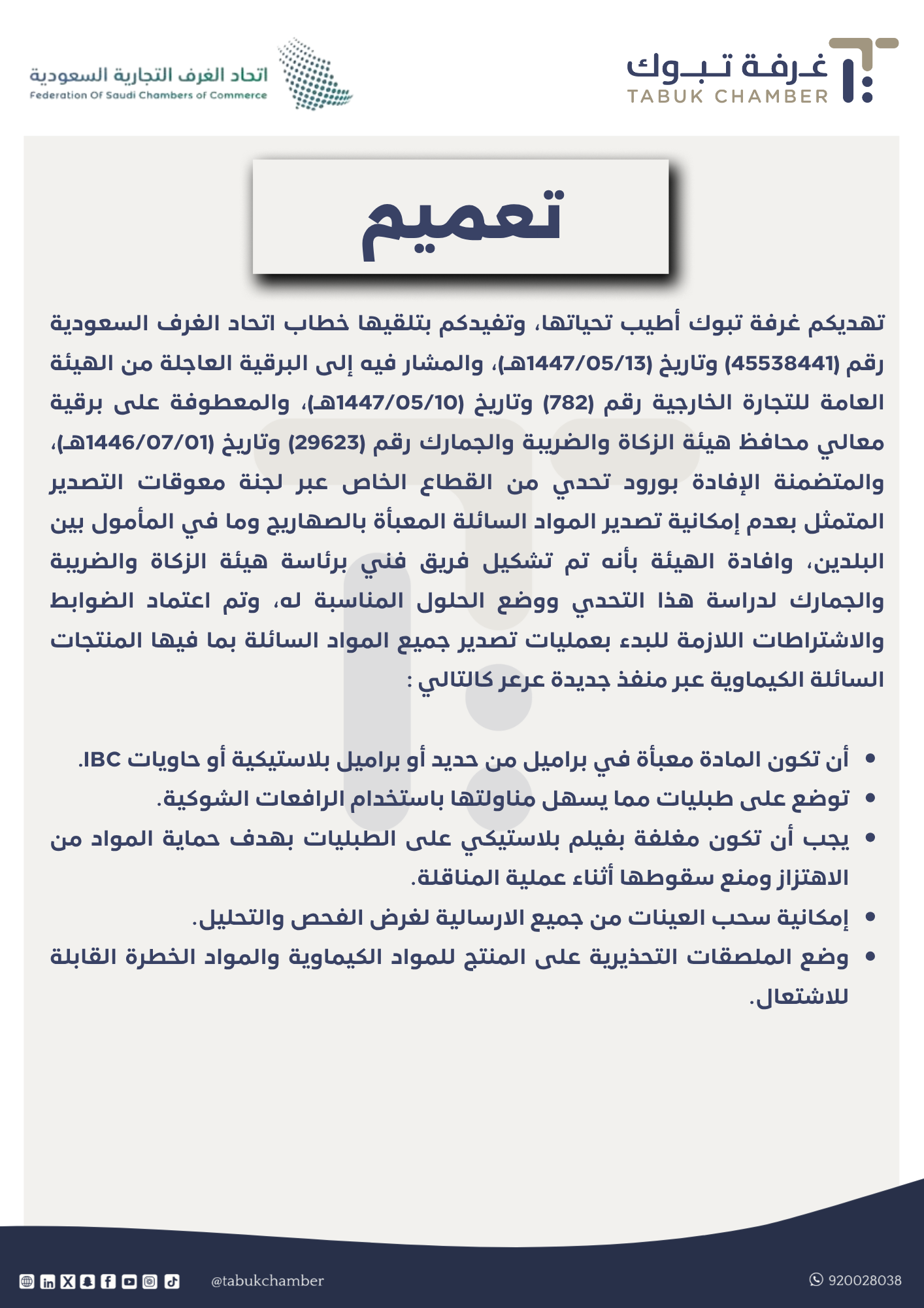 تهديكم غرفة تبوك أطيب تحياتها، وتفيدكم بتلقيها خطاب اتحاد الغرف السعودية رقم (45538441) وتاريخ (1447/05/13هـ)، والمشار فيه إلى البرقية العاجلة من الهيئة العامة للتجارة الخارجية رقم (782) وتاريخ (1447/05/10هـ)، والمعطوفة على برقية معالي محافظ هيئة الزكاة والضريبة والجمارك رقم (29623) وتاريخ (1446/07/01هـ)، والمتضمنة الإفادة بورود تحدي من القطاع الخاص عبر لجنة معوقات التصدير المتمثل بعدم إمكانية تصدير المواد السائلة المعبأة بالصهاريج وما في المأمول بين البلدين، وافادة الهيئة بأنه تم تشكيل فريق فني برئاسة هيئة الزكاة والضريبة والجمارك لدراسة هذا التحدي ووضع الحلول المناسبة له، وتم اعتماد الضوابط والاشتراطات اللازمة للبدء بعمليات تصدير جميع المواد السائلة بما فيها المنتجات السائلة الكيماوية عبر منفذ جديدة عرعر كالتالي : * أن تكون المادة معبأة في براميل من حديد أو براميل بلاستيكية أو حاويات IBC. * توضع على طبليات مما يسهل مناولتها باستخدام الرافعات الشوكية. * يجب أن تكون مغلفة بفيلم بلاستيكي على الطبليات بهدف حماية المواد من الاهتزاز ومنع سقوطها أثناء عملية المناقلة. * إمكانية سحب العينات من جميع الارسالية لغرض الفحص والتحليل. وضع الملصقات التحذيرية على المنتج للمواد الكيماوية والمواد الخطرة القابلة للاشتعال.