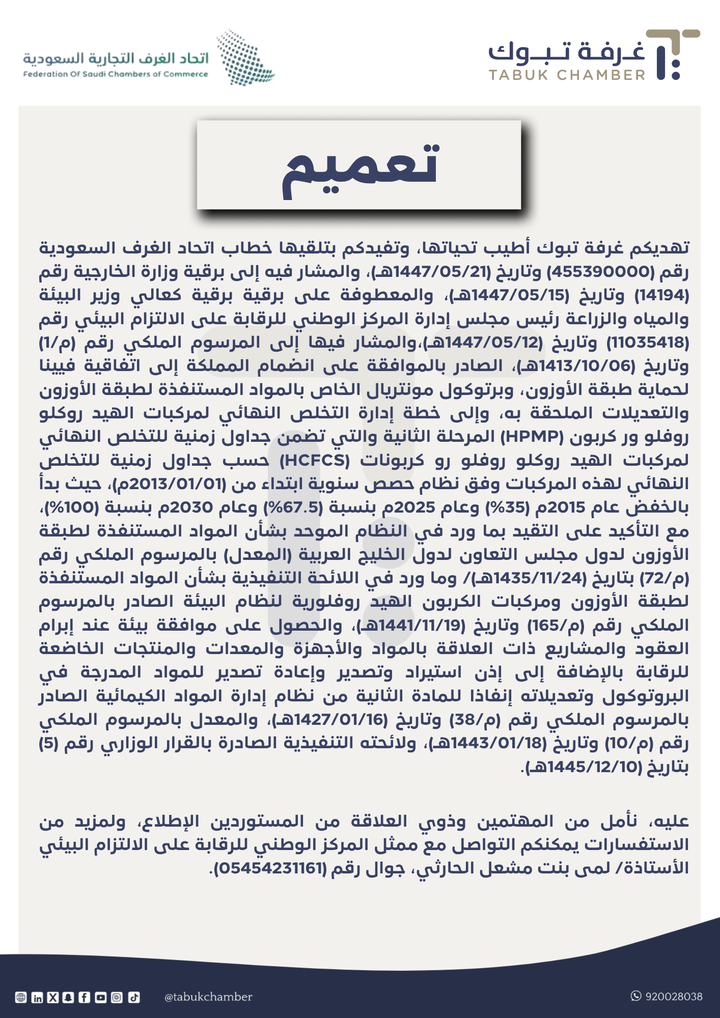 تهديكم غرفة تبوك أطيب تحياتها، وتفيدكم بتلقيها خطاب اتحاد الغرف السعودية رقم (455390000) وتاريخ (1447/05/21هـ)، والمشار فيه إلى برقية وزارة الخارجية رقم (14194) وتاريخ (1447/05/15هـ)، والمعطوفة على برقية برقية كعالي وزير البيئة والمياه والزراعة رئيس مجلس إدارة المركز الوطني للرقابة على الالتزام البيئي رقم (11035418) وتاريخ (1447/05/12هـ)،والمشار فيها إلى المرسوم الملكي رقم (م/1) وتاريخ (1413/10/06هـ)، الصادر بالموافقة على انضمام المملكة إلى اتفاقية فيينا لحماية طبقة الأوزون، وبرتوكول مونتريال الخاص بالمواد المستنفذة لطبقة الأوزون والتعديلات الملحقة به، وإلى خطة إدارة التخلص النهائي لمركبات الهيد روكلو روفلو ور كربون (HPMP) المرحلة الثانية والتي تضمن جداول زمنية للتخلص النهائي لمركبات الهيد روكلو روفلو رو كربونات (HCFCS) حسب جداول زمنية للتخلص النهائي لهذه المركبات وفق نظام حصص سنوية ابتداء من (2013/01/01م)، حيث بدأ بالخفض عام 2015م (35%) وعام 2025م بنسبة (67.5%) وعام 2030م بنسبة (100%)، مع التأكيد على التقيد بما ورد في النظام الموحد بشأن المواد المستنفذة لطبقة الأوزون لدول مجلس التعاون لدول الخليج العربية (المعدل) بالمرسوم الملكي رقم (م/72) بتاريخ (1435/11/24هـ)/ وما ورد في اللائحة التنفيذية بشأن المواد المستنفذة لطبقة الأوزون ومركبات الكربون الهيد روفلورية لنظام البيئة الصادر بالمرسوم الملكي رقم (م/165) وتاريخ (1441/11/19هـ)، والحصول على موافقة بيئة عند إبرام العقود والمشاريع ذات العلاقة بالمواد والأجهزة والمعدات والمنتجات الخاضعة للرقابة بالإضافة إلى إذن استيراد وتصدير وإعادة تصدير للمواد المدرجة في البروتوكول وتعديلاته إنفاذا للمادة الثانية من نظام إدارة المواد الكيمائية الصادر بالمرسوم الملكي رقم (م/38) وتاريخ (1427/01/16هـ)، والمعدل بالمرسوم الملكي رقم (م/10) وتاريخ (1443/01/18هـ)، ولائحته التنفيذية الصادرة بالقرار الوزاري رقم (5) بتاريخ (1445/12/10هـ). عليه، نأمل من المهتمين وذوي العلاقة من المستوردين الإطلاع، ولمزيد من الاستفسارات يمكنكم التواصل مع ممثل المركز الوطني للرقابة على الالتزام البيئي الأستاذة/ لمى بنت مشعل الحارثي، جوال رقم (05454231161).