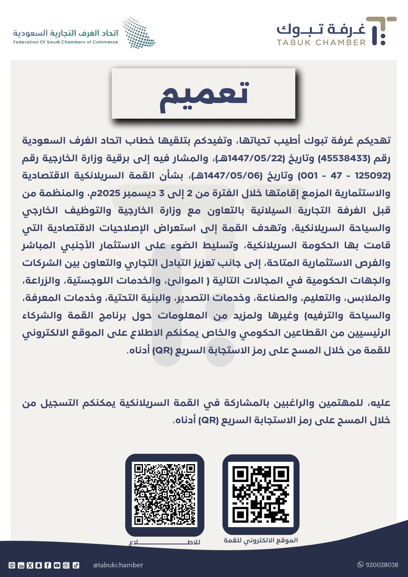 تهديكم غرفة تبوك أطيب تحياتها، وتفيدكم بتلقيها خطاب اتحاد الغرف السعودية رقم (45538433) وتاريخ (1447/05/22هـ)، والمشار فيه إلى برقية وزارة الخارجية رقم (125092 - 47 - 001) وتاريخ (1447/05/06هـ)، بشأن القمة السريلانكية الاقتصادية والاستثمارية المزمع إقامتها خلال الفترة من 2 إلى 3 ديسمبر 2025م، والمنظمة من قبل الغرفة التجارية السيلانية بالتعاون مع وزارة الخارجية والتوظيف الخارجي والسياحة السريلانكية، وتهدف القمة إلى استعراض الإصلاحيات الاقتصادية التي قامت بها الحكومة السريلانكية، وتسليط الضوء على الاستثمار الأجنبي المباشر والفرص الاستثمارية المتاحة، إلى جانب تعزيز التبادل التجاري والتعاون بين الشركات والجهات الحكومية في المجالات التالية ( الموانئ، والخدمات اللوجستية، والزراعة، والملابس، والتعليم، والصناعة، وخدمات التصدير، والبنية التحتية، وخدمات المعرفة، والسياحة والترفيه) وغيرها ولمزيد من المعلومات حول برنامج القمة والشركاء الرئيسيين من القطاعين الحكومي والخاص يمكنكم الإطلاع على الموقع الالكتروني للقمة من خلال المسح على رمز الاستجابة السريع (QR) أدناه. عليه، للمهتمين والراغبين بالمشاركة في القمة السريلانكية يمكنكم التسجيل من خلال المسح على رمز الاستجابة السريع (QR) أدناه.