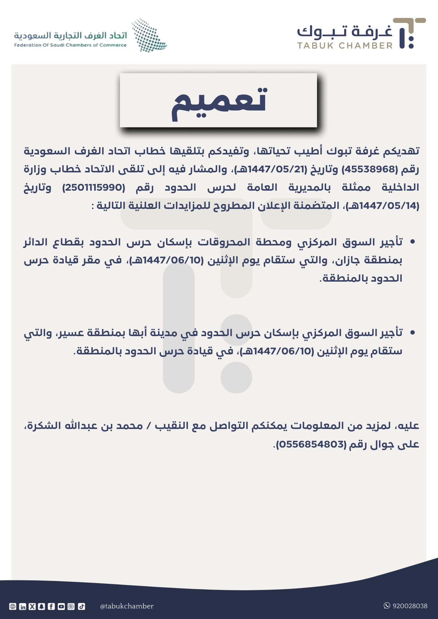 تهديكم غرفة تبوك أطيب تحياتها، وتفيدكم بتلقيها خطاب اتحاد الغرف السعودية رقم (45538968) وتاريخ (1447/05/21هـ)، والمشار فيه إلى تلقى الاتحاد خطاب وزارة الداخلية ممثلة بالمديرية العامة لحرس الحدود رقم (2501115990) وتاريخ (1447/05/14هـ)، المتضمنة الإعلان المطروح للمزايدات العلنية التالية : تأجير السوق المركزي ومحطة المحروقات بإسكان حرس الحدود بقطاع الدائر بمنطقة جازان، والتي ستقام يوم الإثنين (1447/06/10هـ)، في مقر قيادة حرس الحدود بالمنطقة. تأجير السوق المركزي بإسكان حرس الحدود في مدينة أبها بمنطقة عسير، والتي ستقام يوم الإثنين (1447/06/10هـ)، في قيادة حرس الحدود بالمنطقة. عليه، لمزيد من المعلومات يمكن التواصل مع النقيب / محمد بن عبدالله الشكرة، على جوال رقم (0556854803).