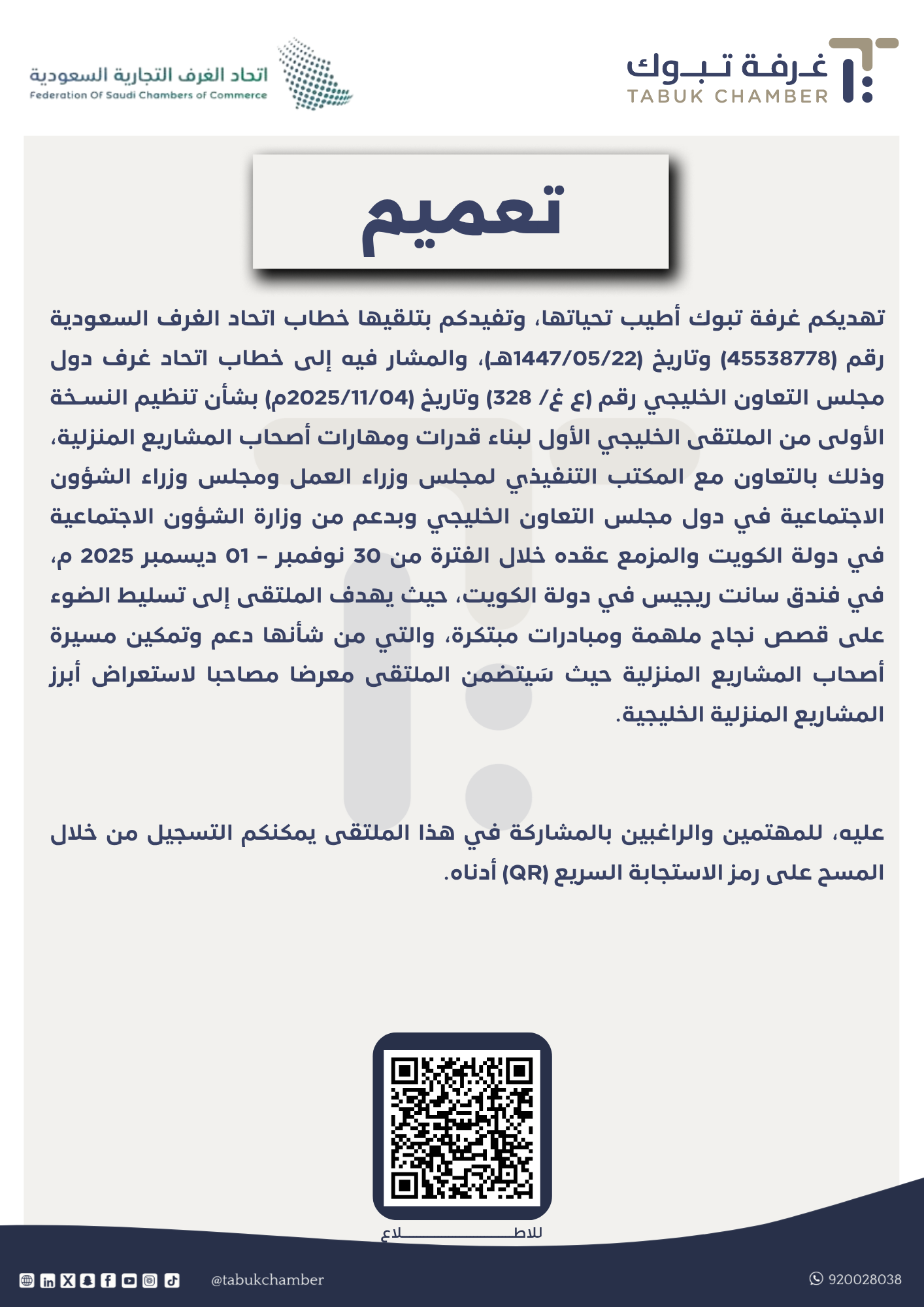 تهديكم غرفة تبوك أطيب تحياتها، وتفيدكم بتلقيها خطاب اتحاد الغرف السعودية رقم (45538778) وتاريخ (1447/05/22هـ)، والمشار فيه إلى خطاب اتحاد غرف دول مجلس التعاون الخليجي رقم (ع غ/ 328) وتاريخ (2025/11/04م) بشأن تنظيم النسـخة الأولى من الملتقى الخليجي الأول لبناء قدرات ومهارات أصحاب المشاريع المنزلية، وذلك بالتعاون مع المكتب التنفيذي لمجلس وزراء العمل ومجلس وزراء الشؤون الاجتماعية في دول مجلس التعاون الخليجي وبدعم من وزارة الشؤون الاجتماعية في دولة الكويت والمزمع عقده خلال الفترة من 30 نوفمبر – 01 ديسمبر 2025 م، في فندق سانت ريجيس في دولة الكويت، حيث يهدف الملتقى إلى تسليط الضوء على قصص نجاح ملهمة ومبادرات مبتكرة، والتي من شأنها دعم وتمكين مسيرة أصحاب المشاريع المنزلية حيث سَيتضمن الملتقى معرضا مصاحبا لاستعراض أبرز المشاريع المنزلية الخليجية. عليه، للمهتمين والراغبين بالمشاركة في هذا الملتقى يمكنكم التسجيل من خلال المسح على رمز الاستجابة السريع (QR) أدناه.