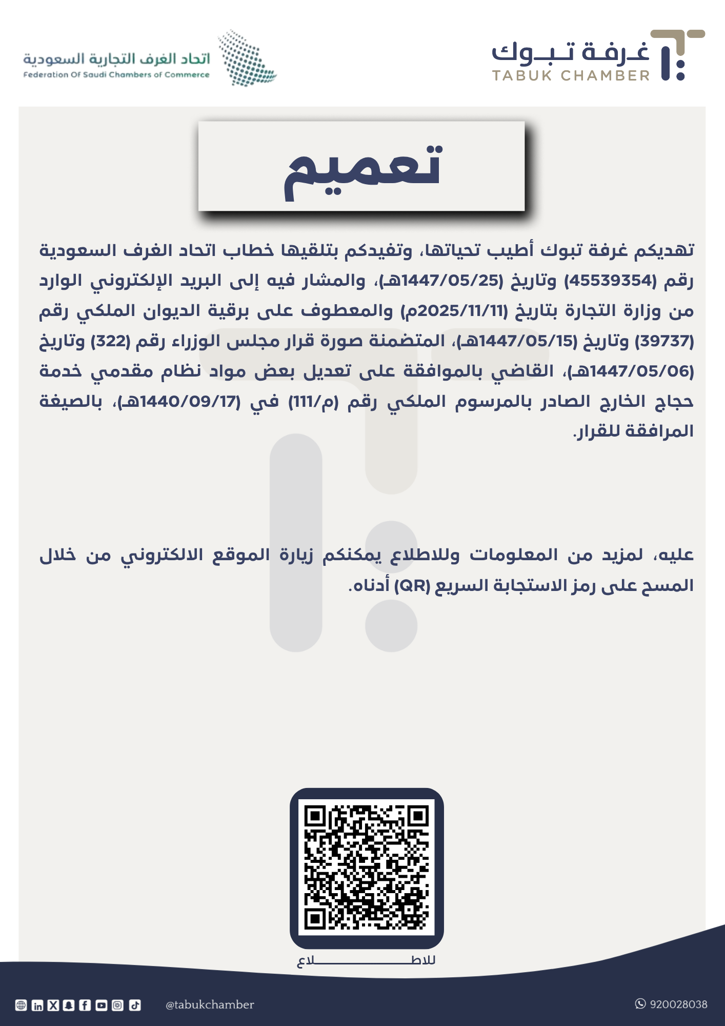 تهديكم غرفة تبوك أطيب تحياتها، وتفيدكم بتلقيها خطاب اتحاد الغرف السعودية رقم (45539354) وتاريخ (1447/05/25هـ)، والمشار فيه إلى البريد الإلكتروني الوارد من وزارة التجارة بتاريخ (2025/11/11م) والمعطوف على برقية الديوان الملكي رقم (39737) وتاريخ (1447/05/15هـ)، المتضمنة صورة قرار مجلس الوزراء رقم (322) وتاريخ (1447/05/06هـ)، القاضي بالموافقة على تعديل بعض مواد نظام مقدمي خدمة حجاج الخارج الصادر بالمرسوم الملكي رقم (م/111) في (1440/09/17هـ)، بالصيغة المرافقة للقرار. عليه، لمزيد من المعلومات وللاطلاع يمكنكم زيارة الموقع الالكتروني من خلال المسح على رمز الاستجابة السريع (QR) أدناه.