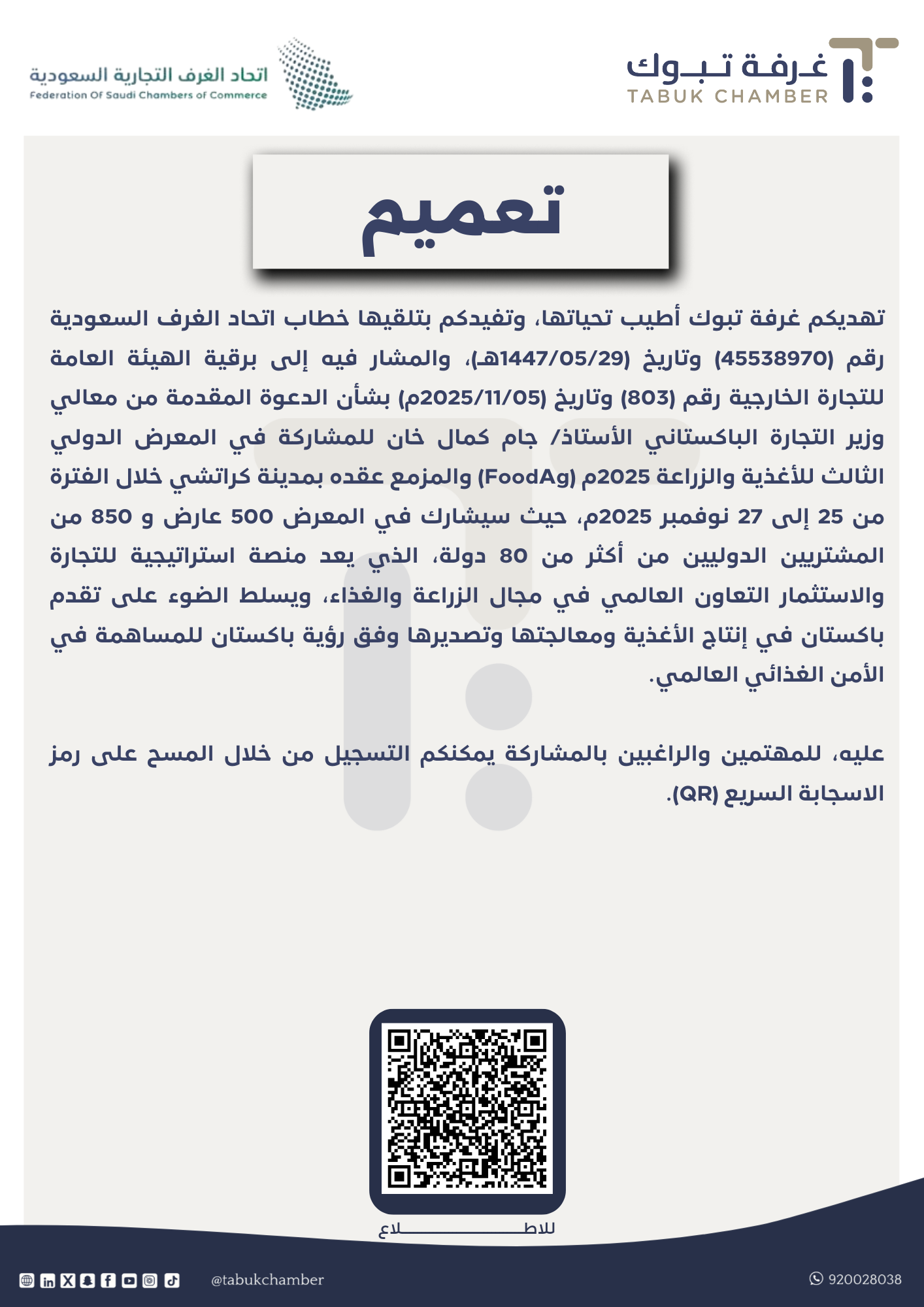 تهديكم غرفة تبوك أطيب تحياتها، وتفيدكم بتلقيها خطاب اتحاد الغرف السعودية رقم (45538970) وتاريخ (1447/05/29هـ)، والمشار فيه إلى برقية الهيئة العامة للتجارة الخارجية رقم (803) وتاريخ (2025/11/05م) بشأن الدعوة المقدمة من معالي وزير التجارة الباكستاني الأستاذ/ جام كمال خان للمشاركة في المعرض الدولي الثالث للأغذية والزراعة 2025م (FoodAg) والمزمع عقده بمدينة كراتشي خلال الفترة من 25 إلى 27 نوفمبر 2025م، حيث سيشارك في المعرض 500 عارض و 850 من المشتريين الدوليين من أكثر من 80 دولة، الذي يعد منصة استراتيجية للتجارة والاستثمار التعاون العالمي في مجال الزراعة والغذاء، ويسلط الضوء على تقدم باكستان في إنتاج الأغذية ومعالجتها وتصديرها وفق رؤية باكستان للمساهمة في الأمن الغذائي العالمي. عليه، للمهتمين والراغبين بالمشاركة يمكنكم التسجيل من خلال المسح على رمز الاستجابة السريع (QR).