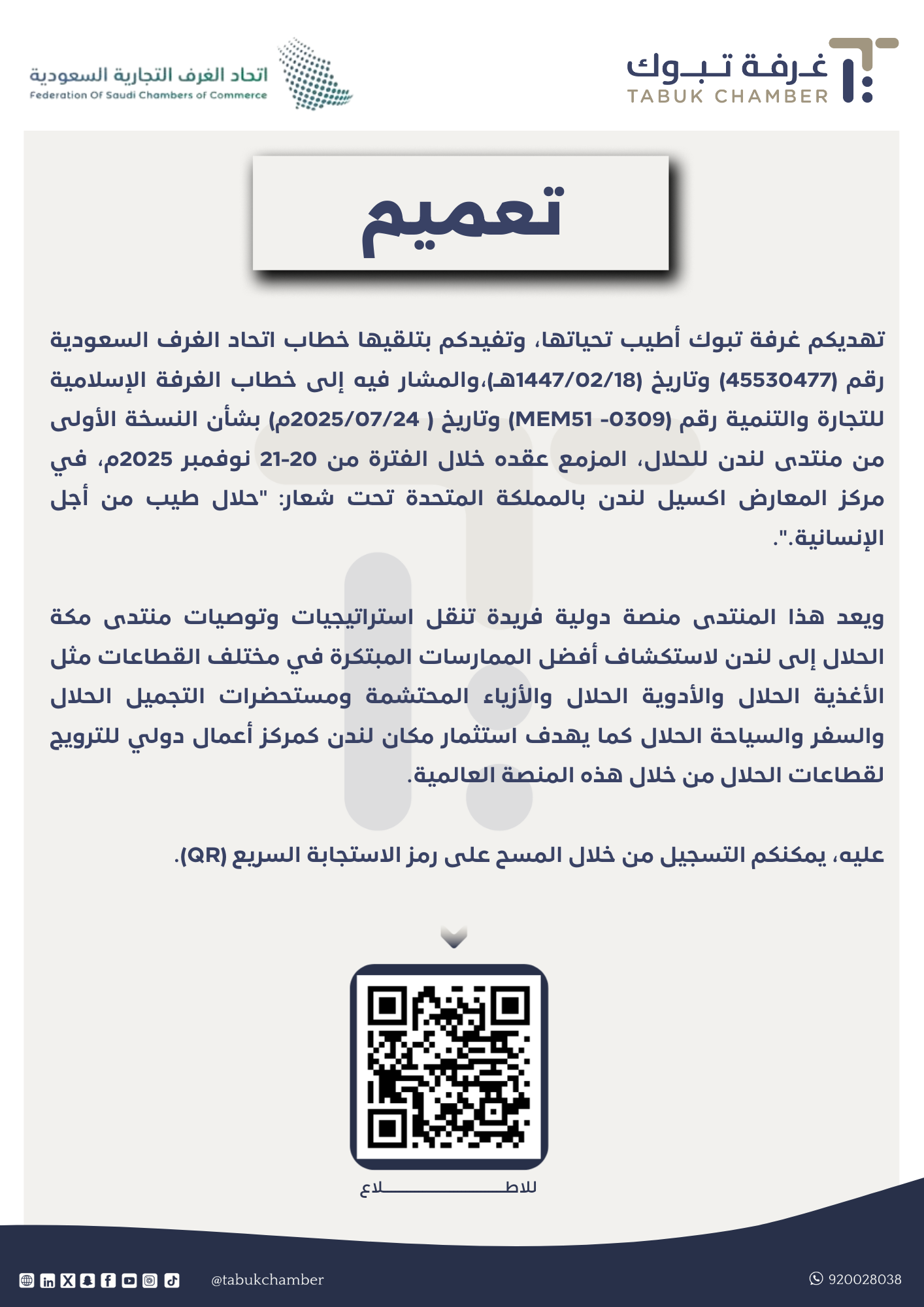 تهديكم غرفة تبوك أطيب تحياتها، وتفيدكم بتلقيها خطاب اتحاد الغرف السعودية رقم (45530477) وتاريخ (1447/02/18هـ)،المشار فيه إلى خطاب الغرفة الإسلامية للتجارة والتنمية رقم (0309- MEM51) وتاريخ (2025/07/24م) بشأن النسخة الأولى من منتدى لندن للحلال، المزمع عقده خلال الفترة من 20-21 نوفمبر 2025م، في مركز المعارض اكسيل لندن بالمملكة المتحدة تحت شعار: "حلال طيب من أجل الإنسانية." ويعد هذا المنتدى منصة دولية فريدة تنقل استراتيجيات وتوصيات منتدى مكة الحلال إلى لندن لاستكشاف أفضل الممارسات المبتكرة في مختلف القطاعات مثل الأغذية الحلال والأدوية الحلال والأزياء المحتشمة ومستحضرات التجميل الحلال والسفر والسياحة الحلال كما يهدف استثمار مكان لندن كمركز أعمال دولي للترويج لقطاعات الحلال من خلال هذه المنصة العالمية. عليه ، يمكنكم التسجيل من خلال المسح على رمز الاستجابة السريع (QR) أدناه.