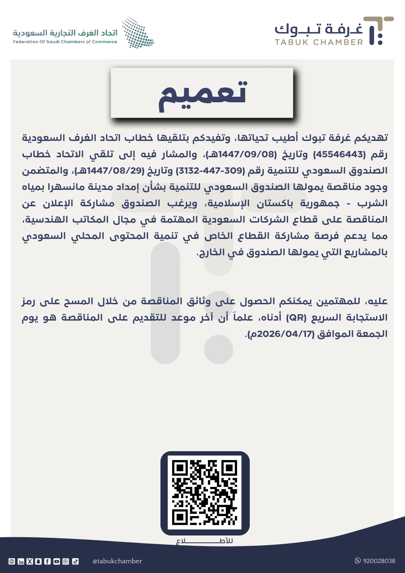 تهديكم غرفة تبوك أطيب تحياتها، وتفيدكم بتلقيها خطاب اتحاد الغرف السعودية رقم (45546443) وتاريخ (1447/09/08هـ)، والمشار فيه إلى تلقي الاتحاد خطاب الصندوق السعودي للتنمية رقم (309-447-3132) وتاريخ (1447/08/29هـ)، والمتضمن وجود مناقصة يمولها الصندوق السعودي للتنمية بشأن إمداد مدينة مانسهرا بمياه الشرب - جمهورية باكستان الإسلامية، ويرغب الصندوق مشاركة الإعلان عن المناقصة على قطاع الشركات السعودية المهتمة في مجال المكاتب الهندسية، مما يدعم فرصة مشاركة القطاع الخاص في تنمية المحتوى المحلي السعودي بالمشاريع التي يمولها الصندوق في الخارج. عليه، للمهتمين يمكنكم الحصول على وثائق المناقصة من خلال المسح على رمز الاستجابة السريع (QR) أدناه، علماَ أن آخر موعد للتقديم على المناقصة هو يوم الجمعة الموافق (2026/04/17م).