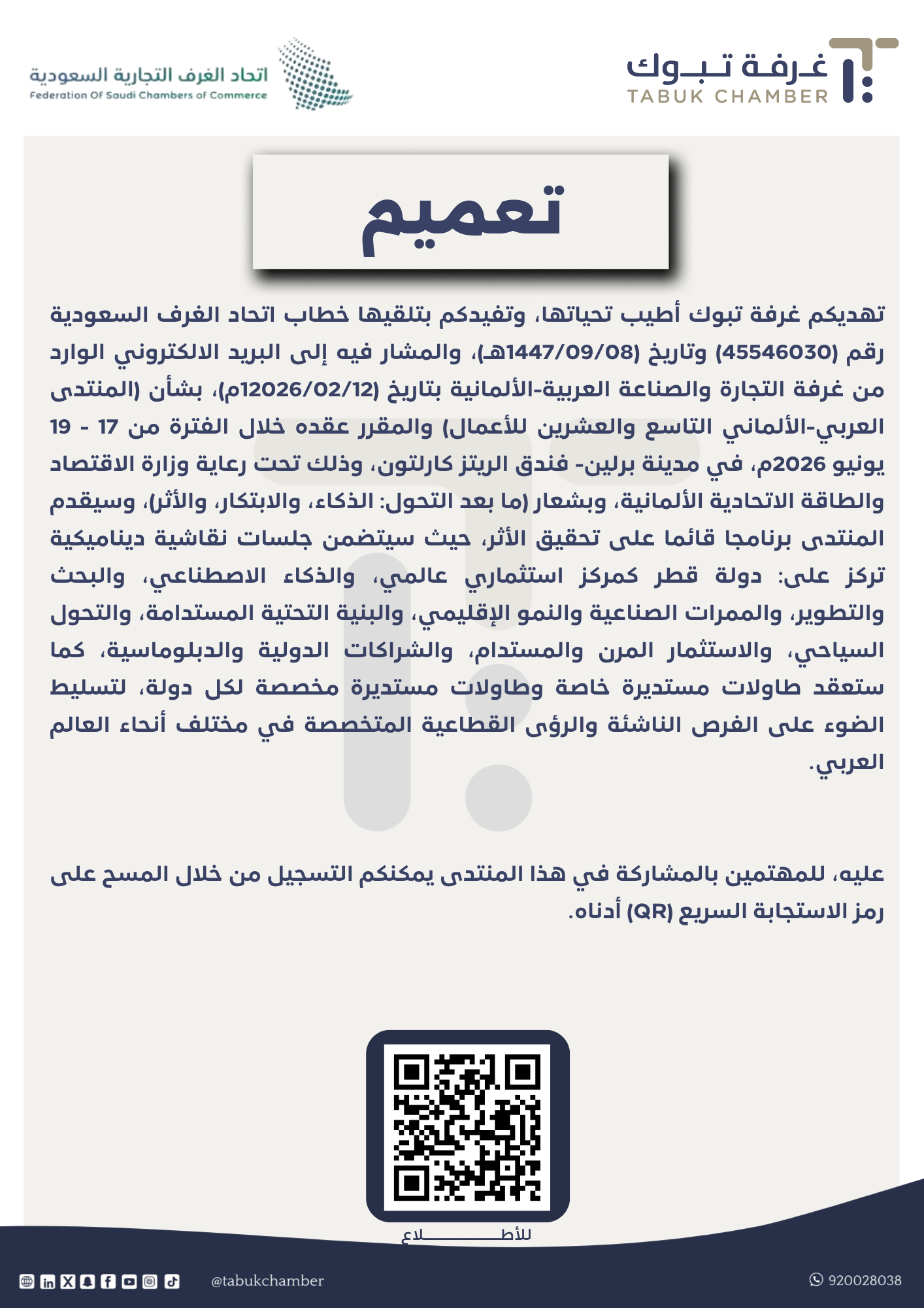 تهديكم غرفة تبوك أطيب تحياتها، وتفيدكم بتلقيها خطاب اتحاد الغرف السعودية رقم (45546030) وتاريخ (1447/09/08هـ)، والمشار فيه إلى البريد الالكتروني الوارد من غرفة التجارة والصناعة العربية-الألمانية بتاريخ (12026/02/12م)، بشأن (المنتدى العربي-الألماني التاسع والعشرين للأعمال) والمقرر عقده خلال الفترة من 17 - 19 يونيو 2026م، في مدينة برلين- فندق الريتز كارلتون، وذلك تحت رعاية وزارة الاقتصاد والطاقة الاتحادية الألمانية، وبشعار (ما بعد التحول: الذكاء، والابتكار، والأثر)، وسيقدم المنتدى برنامجا قائما على تحقيق الأثر، حيث سيتضمن جلسات نقاشية ديناميكية تركز على: دولة قطر كمركز استثماري عالمي، والذكاء الاصطناعي، والبحث والتطوير، والممرات الصناعية والنمو الإقليمي، والبنية التحتية المستدامة، والتحول السياحي، والاستثمار المرن والمستدام، والشراكات الدولية والدبلوماسية، كما ستعقد طاولات مستديرة خاصة وطاولات مستديرة مخصصة لكل دولة، لتسليط الضوء على الفرص الناشئة والرؤى القطاعية المتخصصة في مختلف أنحاء العالم العربي. عليه، للمهتمين بالمشاركة في هذا المنتدى يمكنكم التسجيل من خلال المسح على رمز الاستجابة السريع (QR) أدناه.
