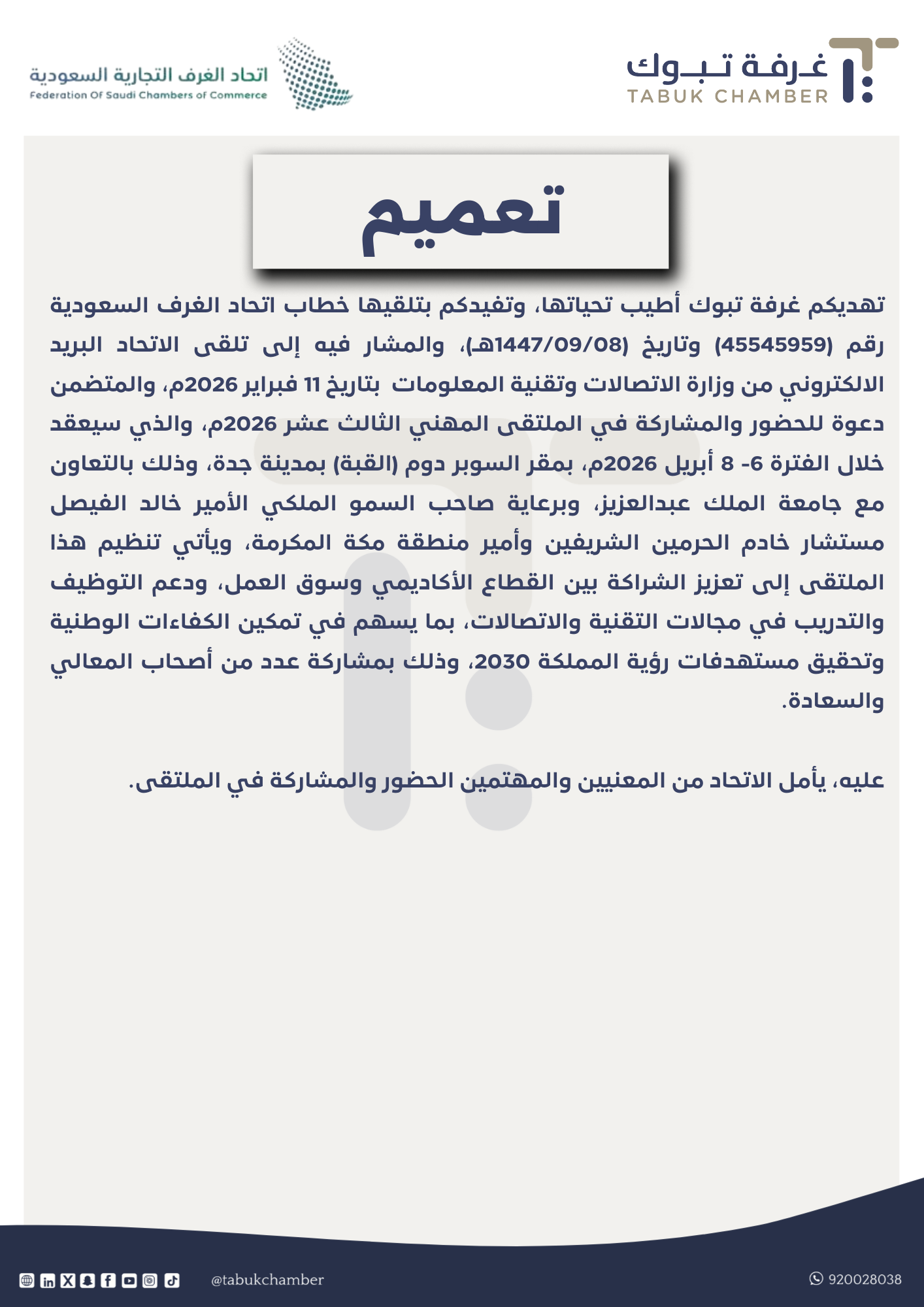تهديكم غرفة تبوك أطيب تحياتها، وتفيدكم بتلقيها خطاب اتحاد الغرف السعودية رقم (45545959) وتاريخ (1447/09/08هـ)، والمشار فيه إلى تلقى الاتحاد البريد الالكتروني من وزارة الاتصالات وتقنية المعلومات بتاريخ 11 فبراير 2026م، والمتضمن دعوة للحضور والمشاركة في الملتقى المهني الثالث عشر 2026م، والذي سيعقد خلال الفترة 6- 8 أبريل 2026م، بمقر السوبر دوم (القبة) بمدينة جدة، وذلك بالتعاون مع جامعة الملك عبدالعزيز، وبرعاية صاحب السمو الملكي الأمير خالد الفيصل مستشار خادم الحرمين الشريفين وأمير منطقة مكة المكرمة، ويأتي تنظيم هذا الملتقى إلى تعزيز الشراكة بين القطاع الأكاديمي وسوق العمل، ودعم التوظيف والتدريب في مجالات التقنية والاتصالات، بما يسهم في تمكين الكفاءات الوطنية وتحقيق مستهدفات رؤية المملكة 2030، وذلك بمشاركة عدد من أصحاب المعالي والسعادة. عليه، يأمل الاتحاد من المعنيين والمهتمين الحضور والمشاركة في الملتقى.