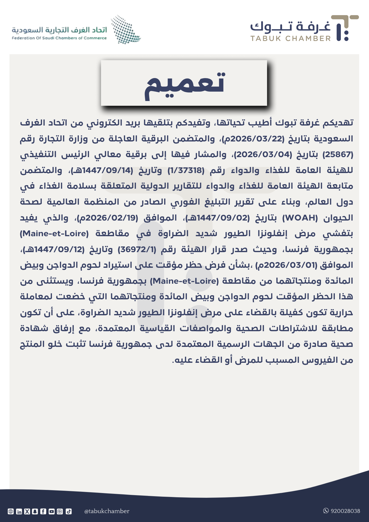 تهديكم غرفة تبوك أطيب تحياتها، وتفيدكم بتلقيها بريد الكتروني من اتحاد الغرف السعودية بتاريخ (2026/03/22م)، والمتضمن البرقية العاجلة من وزارة التجارة رقم (25867) بتاريخ (2026/03/04)، والمشار فيها إلى برقية معالي الرئيس التنفيذي للهيئة العامة للغذاء والدواء رقم (1/37318) وتاريخ (1447/09/14هـ)، والمتضمن متابعة الهيئة العامة للغذاء والدواء للتقارير الدولية المتعلقة بسلامة الغذاء في دول العالم، وبناء على تقرير التبليغ الفوري الصادر من المنظمة العالمية لصحة الحيوان (WOAH) بتاريخ (1447/09/02هـ)، الموافق (2026/02/19م)، والذي يفيد بتفشي مرض إنفلونزا الطيور شديد الضراوة في مقاطعة (Maine-et-Loire) بجمهورية فرنسا، وحيث صدر قرار الهيئة رقم (36972/1) وتاريخ (1447/09/12هـ)، الموافق (2026/03/01م) ،بشأن فرض حظر مؤقت على استيراد لحوم الدواجن وبيض المائدة ومنتجاتهما من مقاطعة (Maine-et-Loire) بجمهورية فرنسا، ويستثنى من هذا الحظر المؤقت لحوم الدواجن وبيض المائدة ومنتجاتهما التي خضعت لمعاملة حرارية تكون كفيلة بالقضاء على مرض إنفلونزا الطيور شديد الضراوة، على أن تكون مطابقة للاشتراطات الصحية والمواصفات القياسية المعتمدة، مع إرفاق شهادة صحية صادرة من الجهات الرسمية المعتمدة لدى جمهورية فرنسا تثبت خلو المنتج من الفيروس المسبب للمرض أو القضاء عليه.