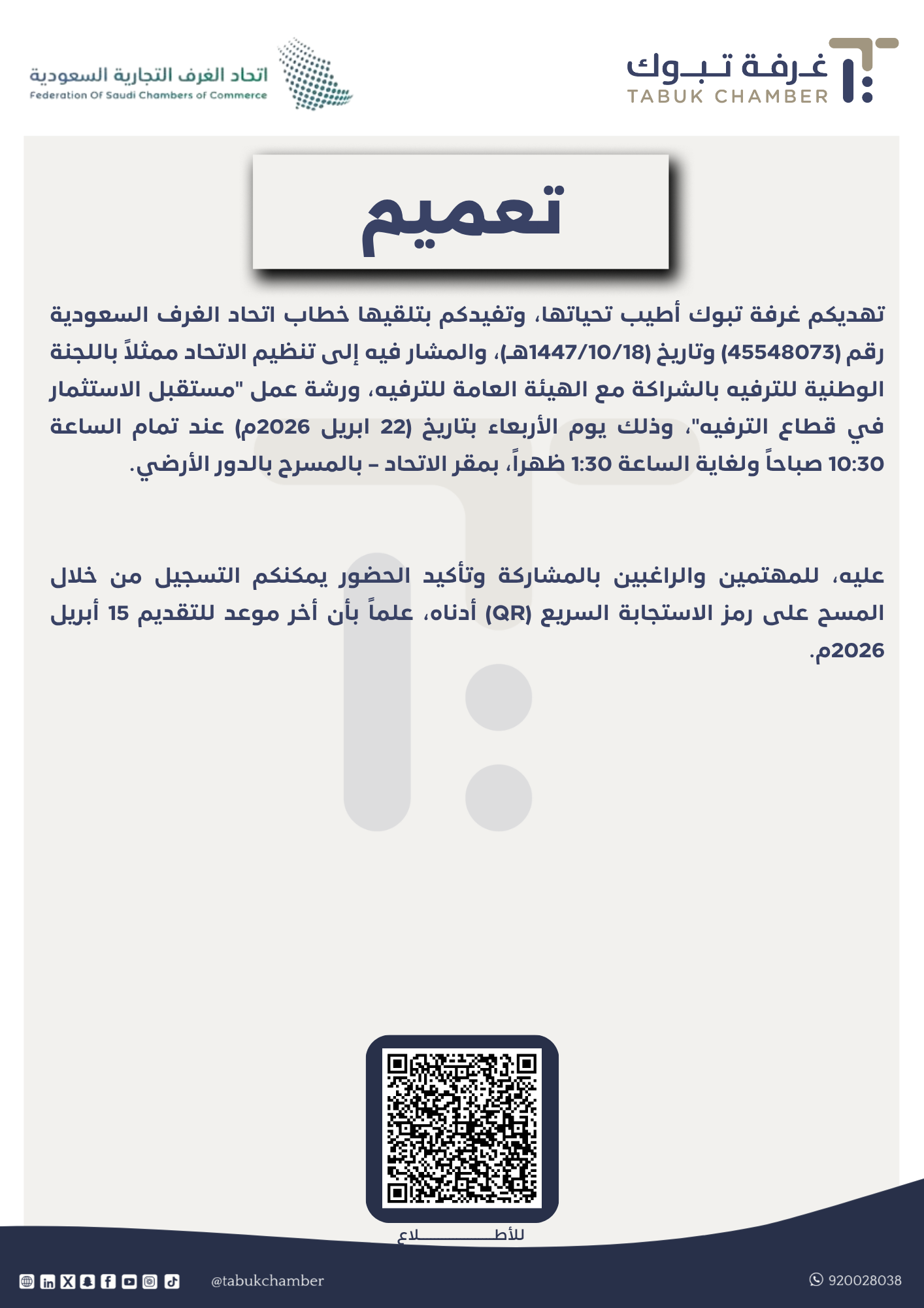 تهديكم غرفة تبوك أطيب تحياتها، وتفيدكم بتلقيها خطاب اتحاد الغرف السعودية رقم (45548073) وتاريخ (1447/10/18هـ)، والمشار فيه إلى تنظيم الاتحاد ممثلاً باللجنة الوطنية للترفيه بالشراكة مع الهيئة العامة للترفيه، ورشة عمل "مستقبل الاستثمار في قطاع الترفيه"، وذلك يوم الأربعاء بتاريخ (22 ابريل 2026م) عند تمام الساعة 10:30 صباحاً ولغاية الساعة 1:30 ظهراً، بمقر الاتحاد – بالمسرح بالدور الأرضي. عليه، للمهتمين والراغبين بالمشاركة وتأكيد الحضور يمكنكم التسجيل من خلال المسح على رمز الاستجابة السريع (QR) أدناه، علماً بأن أخر موعد للتقديم 15 أبريل 2026م.