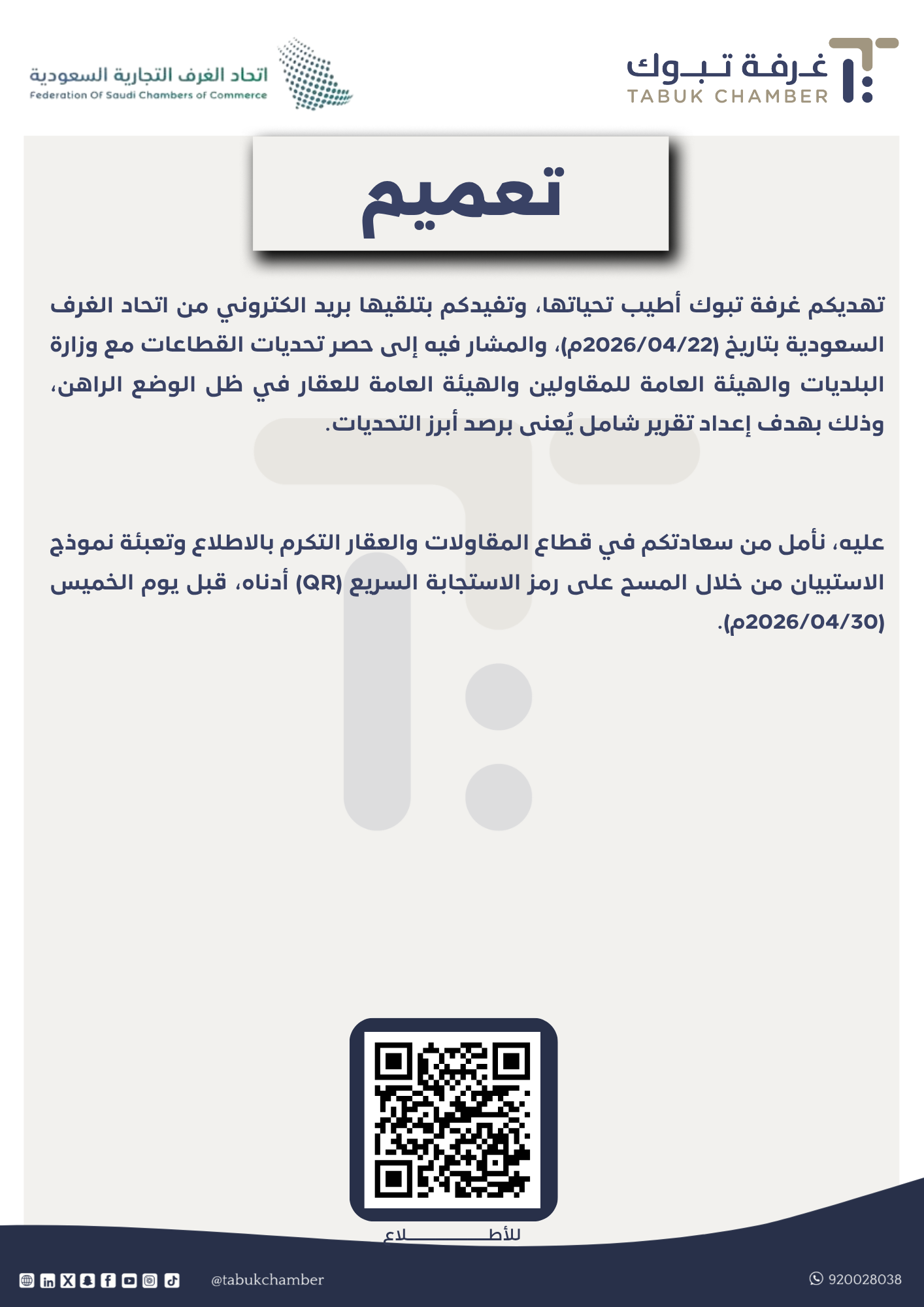 تهديكم غرفة تبوك أطيب تحياتها، وتفيدكم بتلقيها بريد الكتروني من اتحاد الغرف السعودية بتاريخ (2026/04/22م)، والمشار فيه إلى حصر تحديات القطاعات مع وزارة البلديات والهيئة العامة للمقاولين والهيئة العامة للعقار في ظل الوضع الراهن، وذلك بهدف إعداد تقرير شامل يُعنى برصد أبرز التحديات. عليه، نأمل من سعادتكم في قطاع العقار والمقاولات التكرم بالاطلاع وتعبئة نموذج الاستبيان من خلال المسح على رمز الاستجابة السريع (QR) أدناه، قبل يوم الخميس (2026/04/30م).