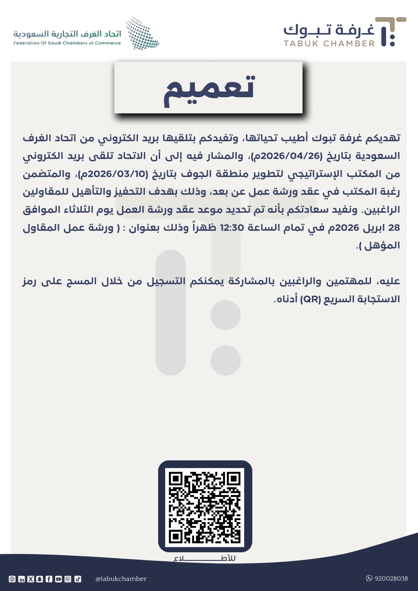 تهديكم غرفة تبوك أطيب تحياتها، وتفيدكم بتلقيها بريد الكتروني من اتحاد الغرف السعودية بتاريخ (2026/04/26م)، والمشار فيه إلى أن الاتحاد تلقى بريد الكتروني من المكتب الإستراتيجي لتطوير منطقة الجوف بتاريخ (2026/03/10م)، والمتضمن رغبة المكتب في عقد ورشة عمل عن بعد، وذلك بهدف التحفيز والتأهيل للمقاولين الراغبين. ونفيد سعادتكم بأنه تم تحديد موعد عقد ورشة العمل يوم الثلاثاء الموافق 28 ابريل 2026م في تمام الساعة 12:30 ظهراً وذلك بعنوان : ( ورشة عمل المقاول المؤهل ). عليه، للمهتمين والراغبين بالمشاركة يمكنكم التسجيل من خلال المسح على رمز الاستجابة السريع (QR) أدناه.