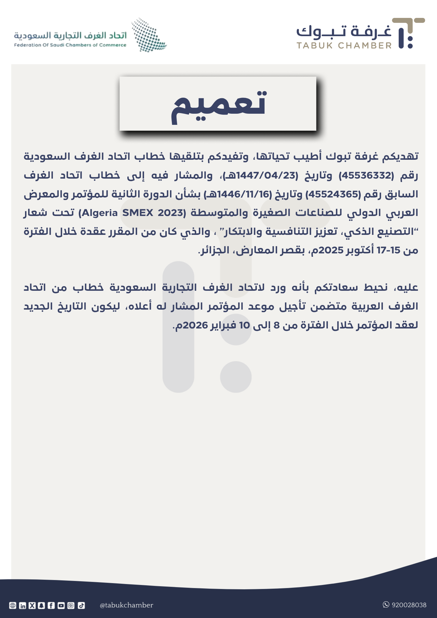 تهديكم غرفة تبوك أطيب تحياتها، وتفيدكم بتلقيها خطاب اتحاد الغرف السعودية رقم (45536332) وتاريخ (1447/04/23هـ)، والمشار فيه إلى خطاب اتحاد الغرف السابق رقم (45524365) وتاريخ (1446/11/16هـ) بشأن الدورة الثانية للمؤتمر والمعرض العربي الدولي للصناعات الصغيرة والمتوسطة (2023 Algeria SMEX) تحت شعار “التصنيع الذكي، تعزيز التنافسية والابتكار” ، والذي كان من المقرر عقدة خلال الفترة من 15-17 أكتوبر 2025م، بقصر المعارض، الجزائر. عليه، نحيط سعادتكم بأنه ورد لاتحاد الغرف التجارية السعودية خطاب من اتحاد الغرف العربية متضمن تأجيل موعد المؤتمر المشار له أعلاه، ليكون التاريخ الجديد لعقد المؤتمر خلال الفترة من 8 إلى 10 فبراير 2026م.