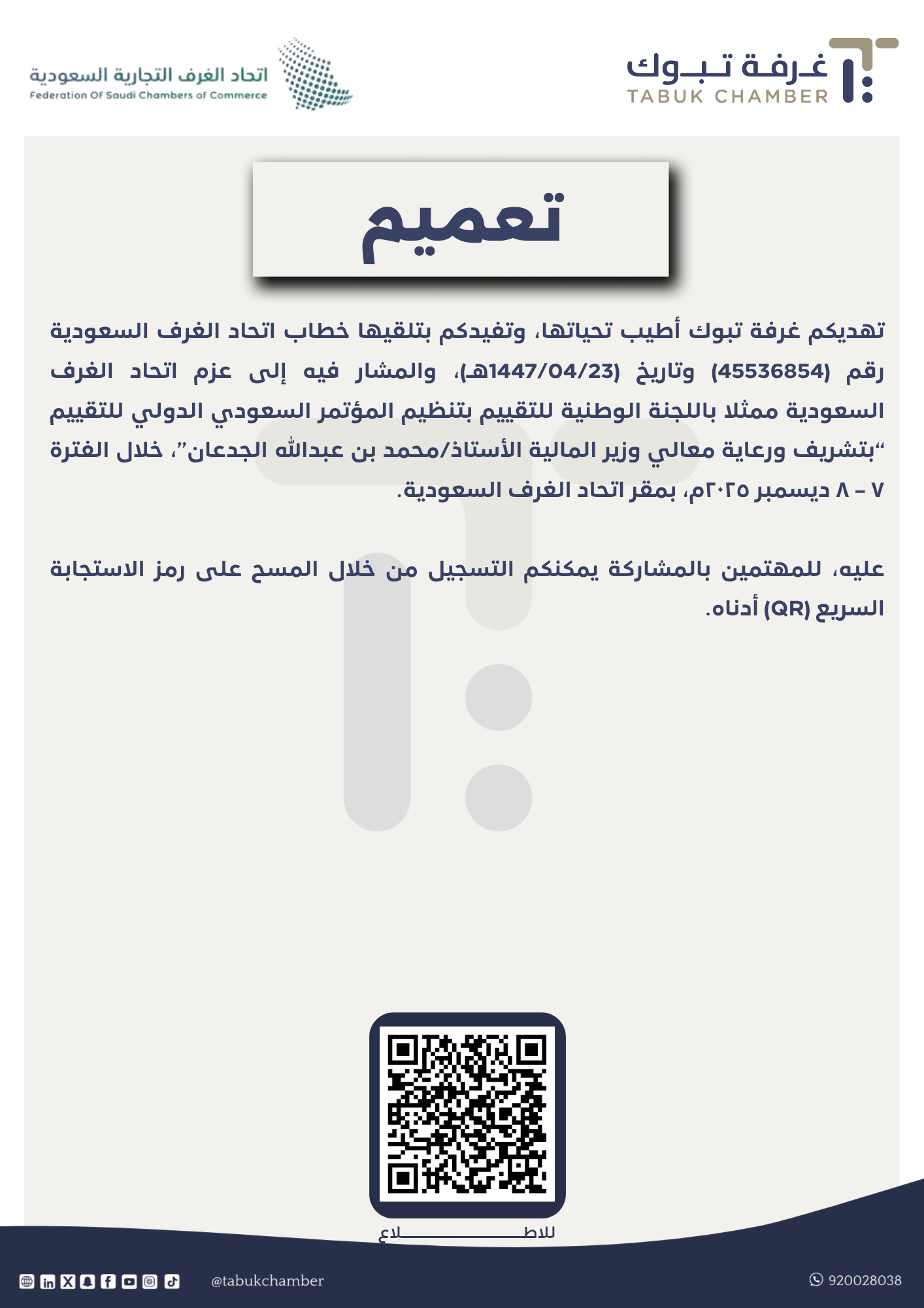 تهديكم غرفة تبوك أطيب تحياتها، وتفيدكم بتلقيها خطاب اتحاد الغرف السعودية رقم (45536854) وتاريخ (1447/04/23هـ)، والمشار فيه إلى عزم اتحاد الغرف السعودية ممثلا باللجنة الوطنية للتقييم بتنظيم المؤتمر السعودي الدولي للتقييم “بتشريف ورعاية معالي وزير المالية الأستاذ/محمد بن عبدالله الجدعان”، خلال الفترة ٧ – ٨ ديسمبر ٢٠٢٥م، بمقر اتحاد الغرف السعودية. عليه، للمهتمين بالمشاركة يمكنكم التسجيل من خلال المسح على رمز الاستجابة السريع (QR) أدناه.