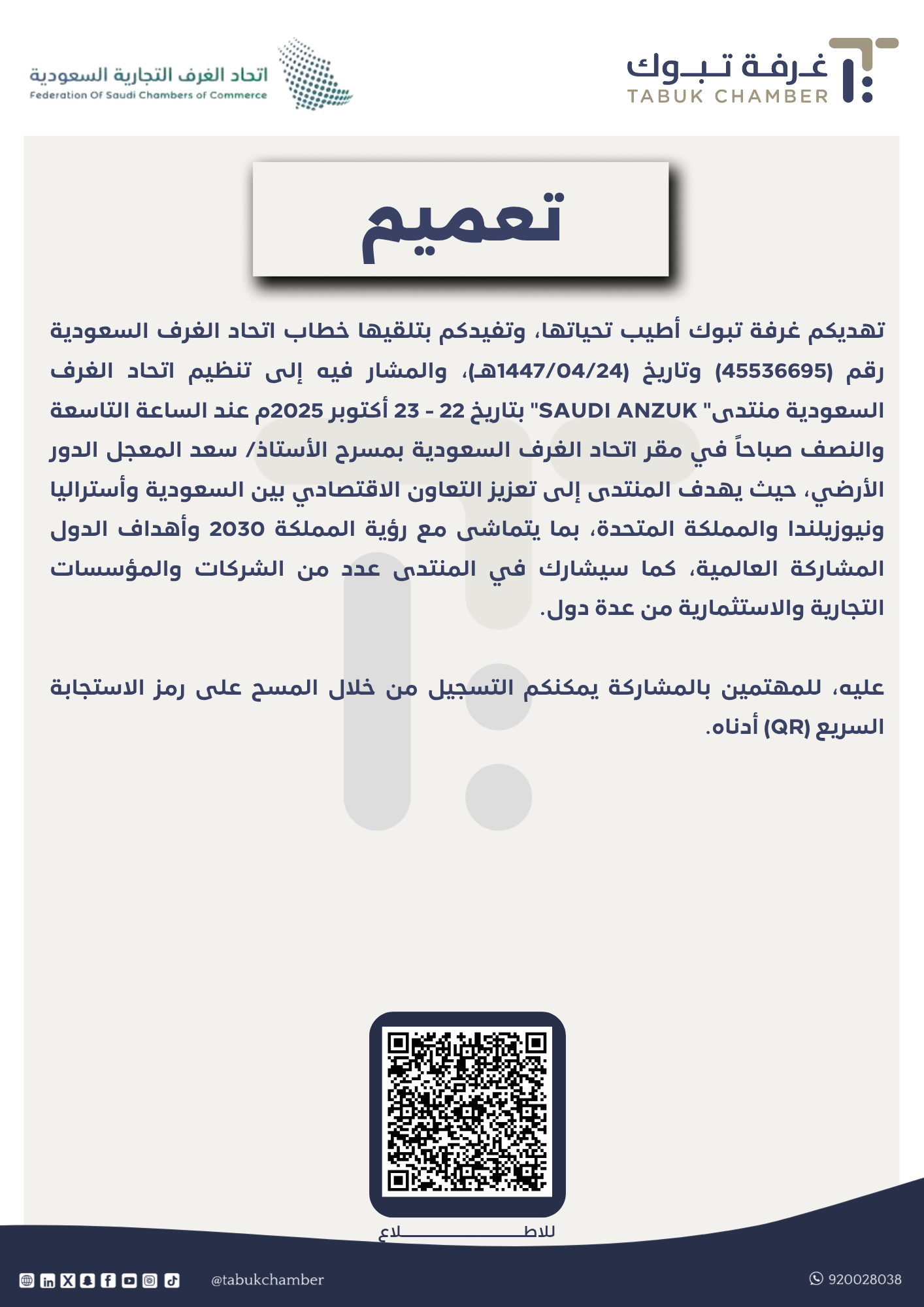 تهديكم غرفة تبوك أطيب تحياتها، وتفيدكم بتلقيها خطاب اتحاد الغرف السعودية رقم (45536695) وتاريخ (1447/04/24هـ)، والمشار فيه إلى تنظيم اتحاد الغرف السعودية منتدى" SAUDI ANZUK" بتاريخ 22 - 23 أكتوبر 2025م عند الساعة التاسعة والنصف صباحاً في مقر اتحاد الغرف السعودية بمسرح الأستاذ/ سعد المعجل الدور الأرضي، حيث يهدف المنتدى إلى تعزيز التعاون الاقتصادي بين السعودية وأستراليا ونيوزيلندا والمملكة المتحدة، بما يتماشى مع رؤية المملكة 2030 وأهداف الدول المشاركة العالمية، كما سيشارك في المنتدى عدد من الشركات والمؤسسات التجارية والاستثمارية من عدة دول. عليه، للمهتمين بالمشاركة يمكنكم التسجيل من خلال المسح على رمز الاستجابة السريع (QR) أدناه.