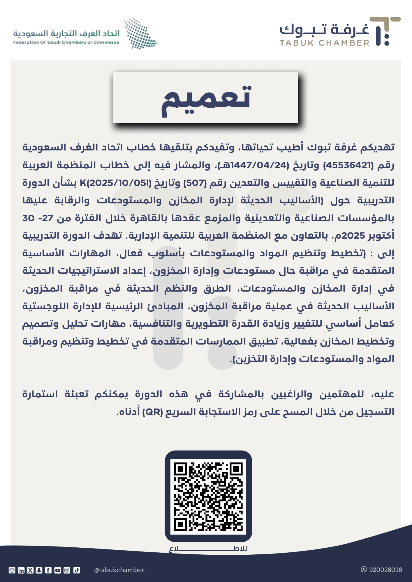 تهديكم غرفة تبوك أطيب تحياتها، وتفيدكم بتلقيها خطاب اتحاد الغرف السعودية رقم (45536421) وتاريخ (1447/04/24هـ)، والمشار فيه إلى خطاب المنظمة العربية للتنمية الصناعية والتقييس والتعدين رقم (507) وتاريخ (2025/10/05l)K بشأن الدورة التدريبية حول (الأساليب الحديثة لإدارة المخازن والمستودعات والرقابة عليها بالمؤسسات الصناعية والتعدينية والمزمع عقدها بالقاهرة خلال الفترة من 27- 30 أكتوبر 2025م، بالتعاون مع المنظمة العربية للتنمية الإدارية. تهدف الدورة التدريبية إلى : (تخطيط وتنظيم المواد والمستودعات بأسلوب فعال، المهارات الأساسية المتقدمة في مراقبة حال مستودعات وإدارة المخزون، إعداد الاستراتيجيات الحديثة في إدارة المخازن والمستودعات، الطرق والنظم الحديثة في مراقبة المخزون، الأساليب الحديثة في عملية مراقبة المخزون، المبادئ الرئيسية للإدارة اللوجستية كعامل أساسي للتغيير وزيادة القدرة التطويرية والتنافسية، مهارات تحليل وتصميم وتخطيط المخازن بفعالية، تطبيق الممارسات المتقدمة في تخطيط وتنظيم ومراقبة المواد والمستودعات وإدارة التخزين). عليه، للمهتمين والراغبين بالمشاركة في هذه الدورة يمكنكم تعبئة استمارة التسجيل من خلال المسح على رمز الاستجابة السريع (QR) أدناه.
