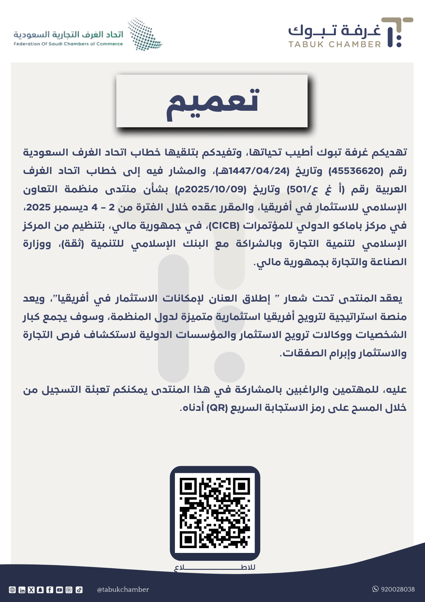 تهديكم غرفة تبوك أطيب تحياتها، وتفيدكم بتلقيها خطاب اتحاد الغرف السعودية رقم (45536620) وتاريخ (1447/04/24هـ)، والمشار فيه إلى خطاب اتحاد الغرف العربية رقم (أ غ ع/501) وتاريخ (2025/10/09م) بشأن منتدى منظمة التعاون الإسلامي للاستثمار في أفريقيا، والمقرر عقده خلال الفترة من 2 – 4 ديسمبر 2025، في مركز باماكو الدولي للمؤتمرات (CICB)، في جمهورية مالي، بتنظيم من المركز الإسلامي لتنمية التجارة وبالشراكة مع البنك الإسلامي للتنمية (ثقة)، ووزارة الصناعة والتجارة بجمهورية مالي. يعقد المنتدى تحت شعار ” إطلاق العنان لإمكانات الاستثمار في أفريقيا”، ويعد منصة استراتيجية لترويج أفريقيا استثمارية متميزة لدول المنظمة، وسوف يجمع كبار الشخصيات ووكالات ترويج الاستثمار والمؤسسات الدولية لاستكشاف فرص التجارة والاستثمار وإبرام الصفقات. عليه، للمهتمين والراغبين بالمشاركة في هذا المنتدى يمكنكم تعبئة التسجيل من خلال المسح على رمز الاستجابة السريع (QR) أدناه.