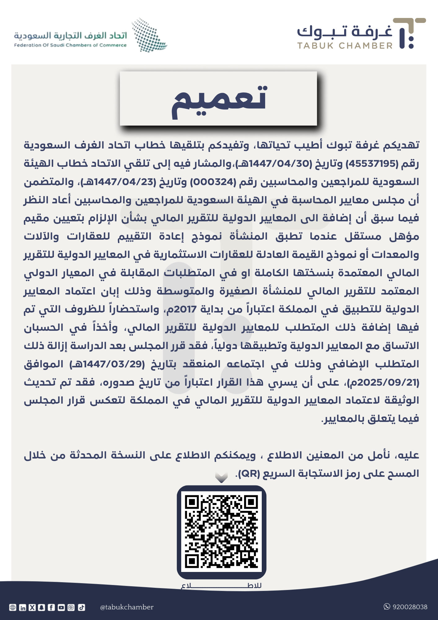 تهديكم غرفة تبوك أطيب تحياتها، وتفيدكم بتلقيها خطاب اتحاد الغرف السعودية رقم (45537195) وتاريخ (1447/04/30هـ)،والمشار فيه إلى تلقي الاتحاد خطاب الهيئة السعودية للمراجعين والمحاسبين رقم (000324) وتاريخ (1447/04/23هـ)، والمتضمن أن مجلس معايير المحاسبة في الهيئة السعودية للمراجعين والمحاسبين أعاد النظر فيما سبق أن إضافة الى المعايير الدولية للتقرير المالي بشأن الإلزام بتعيين مقيم مؤهل مستقل عندما تطبق المنشأة نموذج إعادة التقييم للعقارات والآلات والمعدات أو نموذج القيمة العادلة للعقارات الاستثمارية في المعايير الدولية للتقرير المالي المعتمدة بنسختها الكاملة او في المتطلبات المقابلة في المعيار الدولي المعتمد للتقرير المالي للمنشأة الصغيرة والمتوسطة وذلك إبان اعتماد المعايير الدولية للتطبيق في المملكة اعتباراً من بداية 2017م، واستحضاراً للظروف التي تم فيها إضافة ذلك المتطلب للمعايير الدولية للتقرير المالي، وأخذاً في الحسبان الاتساق مع المعايير الدولية وتطبيقها دولياً، فقد قرر المجلس بعد الدراسة إزالة ذلك المتطلب الإضافي وذلك في اجتماعه المنعقد بتاريخ (1447/03/29هـ) الموافق (2025/09/21م)، على أن يسري هذا القرار اعتباراً من تاريخ صدوره، فقد تم تحديث الوثيقة لاعتماد المعايير الدولية للتقرير المالي في المملكة لتعكس قرار المجلس فيما يتعلق بالمعايير. عليه، نأمل من المعنين الاطلاع ، ويمكنكم الاطلاع على النسخة المحدثة من خلال المسح على رمز الاستجابة السريع (QR). ------------------------------