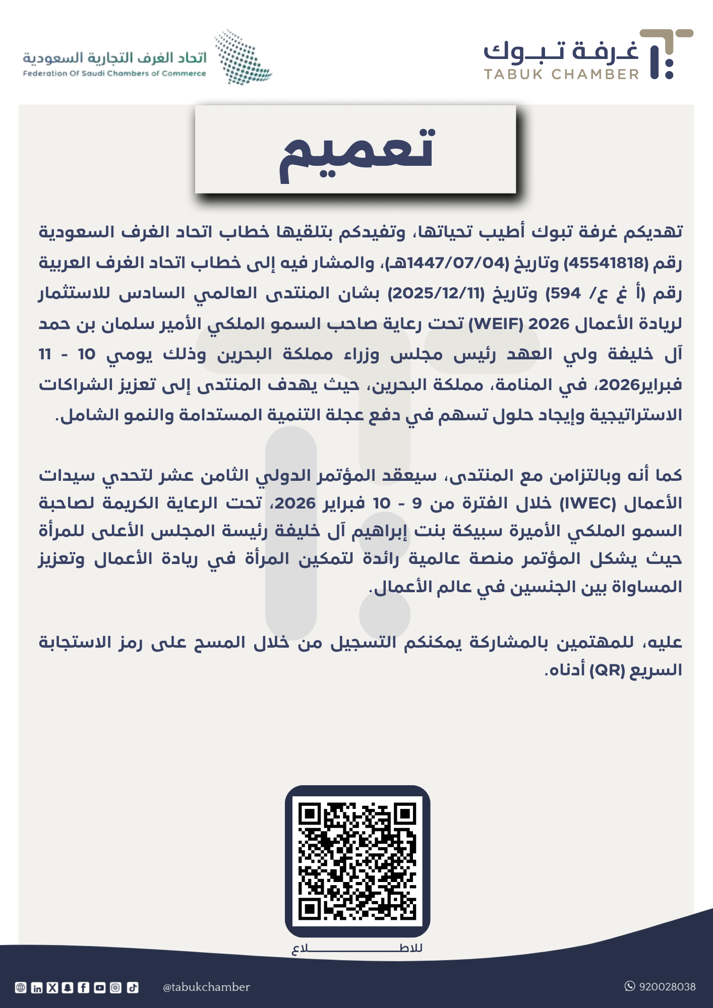 تهديكم غرفة تبوك أطيب تحياتها، وتفيدكم بتلقيها خطاب اتحاد الغرف السعودية رقم (45541818) وتاريخ (1447/07/04هـ)، والمشار فيه إلى خطاب اتحاد الغرف العربية رقم (أ غ ع/ 594) وتاريخ (2025/12/11) بشان المنتدى العالمي السادس للاستثمار لريادة الأعمال WEIF) 2026) تحت رعاية صاحب السمو الملكي الأمير سلمان بن حمد آل خليفة ولي العهد رئيس مجلس وزراء مملكة البحرين وذلك يومي 10 - 11 فبراير2026، في المنامة، مملكة البحرين، حيث يهدف المنتدى إلى تعزيز الشراكات الاستراتيجية وإيجاد حلول تسهم في دفع عجلة التنمية المستدامة والنمو الشامل. كما أنه وبالتزامن مع المنتدى، سيعقد المؤتمر الدولي الثامن عشر لتحدي سيدات الأعمال (IWEC) خلال الفترة من 9 - 10 فبراير 2026، تحت الرعاية الكريمة لصاحبة السمو الملكي الأميرة سبيكة بنت إبراهيم آل خليفة رئيسة المجلس الأعلى للمرأة حيث يشكل المؤتمر منصة عالمية رائدة لتمكين المرأة في ريادة الأعمال وتعزيز المساواة بين الجنسين في عالم الأعمال. عليه، للمهتمين بالمشاركة يمكنكم التسجيل من خلال المسح على رمز الاستجابة السريع (QR) أدناه.