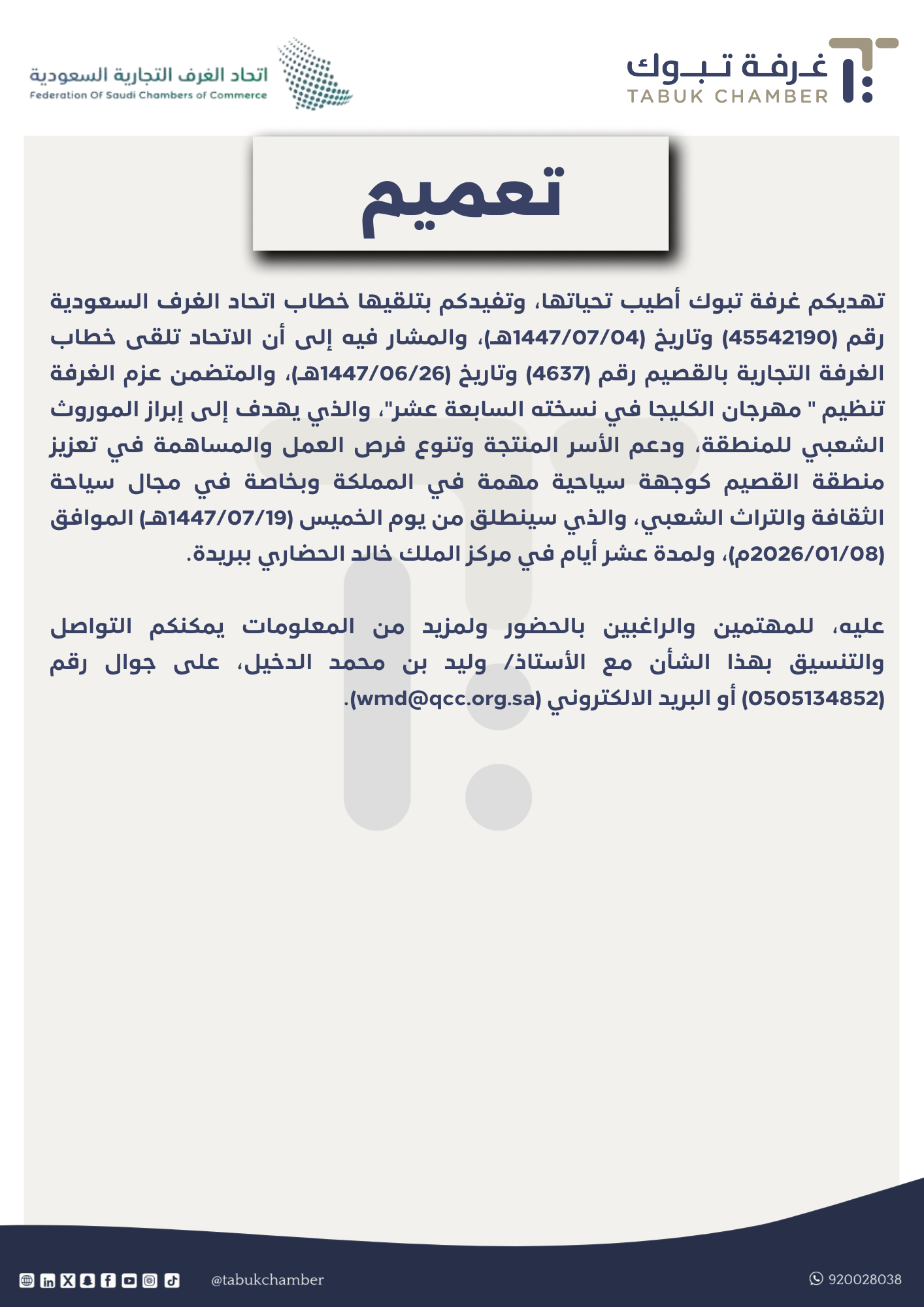 تهديكم غرفة تبوك أطيب تحياتها، وتفيدكم بتلقيها خطاب اتحاد الغرف السعودية رقم (45542190) وتاريخ (1447/07/04هـ)، والمشار فيه إلى أن الاتحاد تلقى خطاب الغرفة التجارية بالقصيم رقم (4637) وتاريخ (1447/06/26هـ)، والمتضمن عزم الغرفة تنظيم " مهرجان الكليجا في نسخته السابعة عشر"، والذي يهدف إلى إبراز الموروث الشعبي للمنطقة، ودعم الأسر المنتجة وتنوع فرص العمل والمساهمة في تعزيز منطقة القصيم كوجهة سياحية مهمة في المملكة وبخاصة في مجال سياحة الثقافة والتراث الشعبي، والذي سينطلق من يوم الخميس (1447/07/19هـ) الموافق (2026/01/08م)، ولمدة عشر أيام في مركز الملك خالد الحضاري ببريدة. عليه، للمهتمين والراغبين بالحضور ولمزيد من المعلومات يمكنكم التواصل والتنسيق بهذا الشأن مع الأستاذ/ وليد بن محمد الدخيل، على جوال رقم (0505134852) أو البريد الالكتروني (wmd@qcc.org.sa).
