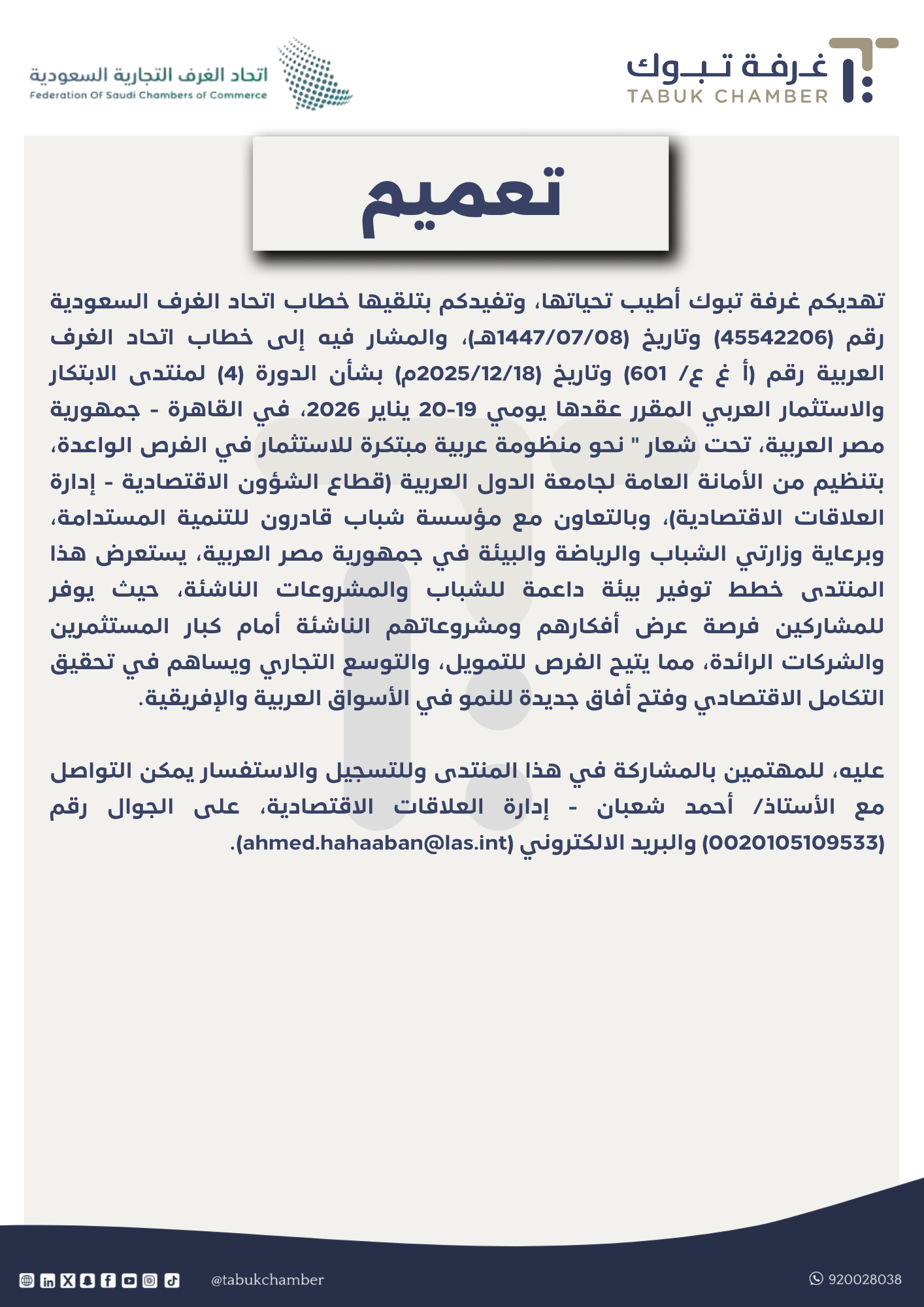 تهديكم غرفة تبوك أطيب تحياتها، وتفيدكم بتلقيها خطاب اتحاد الغرف السعودية رقم (45542206) وتاريخ (1447/07/08هـ)، والمشار فيه إلى خطاب اتحاد الغرف العربية رقم (أ غ ع/ 601) وتاريخ (2025/12/18م) بشأن الدورة (4) لمنتدى الابتكار والاستثمار العربي المقرر عقدها يومي 19-20 يناير 2026، في القاهرة - جمهورية مصر العربية، تحت شعار " نحو منظومة عربية مبتكرة للاستثمار في الفرص الواعدة، بتنظيم من الأمانة العامة لجامعة الدول العربية (قطاع الشؤون الاقتصادية - إدارة العلاقات الاقتصادية)، وبالتعاون مع مؤسسة شباب قادرون للتنمية المستدامة، وبرعاية وزارتي الشباب والرياضة والبيئة في جمهورية مصر العربية، يستعرض هذا المنتدى خطط توفير بيئة داعمة للشباب والمشروعات الناشئة، حيث يوفر للمشاركين فرصة عرض أفكارهم ومشروعاتهم الناشئة أمام كبار المستثمرين والشركات الرائدة، مما يتيح الفرص للتمويل، والتوسع التجاري ويساهم في تحقيق التكامل الاقتصادي وفتح أفاق جديدة للنمو في الأسواق العربية والإفريقية. عليه، للمهتمين بالمشاركة في هذا المنتدى وللتسجيل والاستفسار يمكن التواصل مع الأستاذ/ أحمد شعبان - إدارة العلاقات الاقتصادية، على الجوال رقم (0020105109533) والبريد الالكتروني (ahmed.hahaaban@las.int).