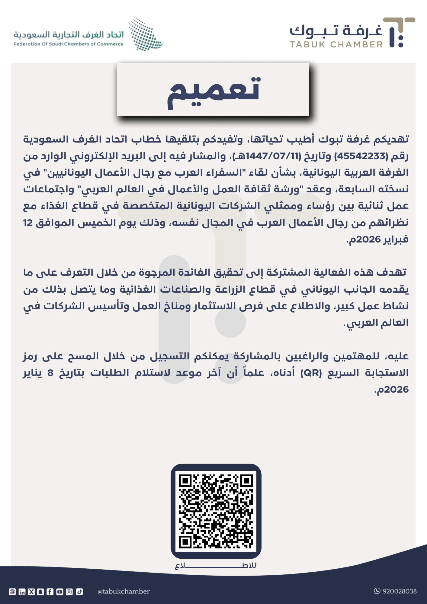تهديكم غرفة تبوك أطيب تحياتها، وتفيدكم بتلقيها خطاب اتحاد الغرف السعودية رقم (45542233) وتاريخ (1447/07/11هـ)، والمشار فيه إلى البريد الإلكتروني الوارد من الغرفة العربية اليونانية، بشأن لقاء "السفراء العرب مع رجال الأعمال اليونانيين" في نسخته السابعة، وعقد "ورشة ثقافة العمل والأعمال في العالم العربي" واجتماعات عمل ثنائية بين رؤساء وممثلي الشركات اليونانية المتخصصة في قطاع الغذاء مع نظرائهم من رجال الأعمال العرب في المجال نفسه، وذلك يوم الخميس الموافق 12 فبراير 2026م. تهدف هذه الفعالية المشتركة إلى تحقيق الفائدة المرجوة من خلال التعرف على ما يقدمه الجانب اليوناني في قطاع الزراعة والصناعات الغذائية وما يتصل بذلك من نشاط عمل كبير، والاطلاع على فرص الاستثمار ومناخ العمل وتأسيس الشركات في العالم العربي. عليه، للمهتمين والراغبين بالمشاركة يمكنكم التسجيل من خلال المسح على رمز الاستجابة السريع (QR) أدناه، علماً أن آخر موعد لاستلام الطلبات بتاريخ 8 يناير 2026م.