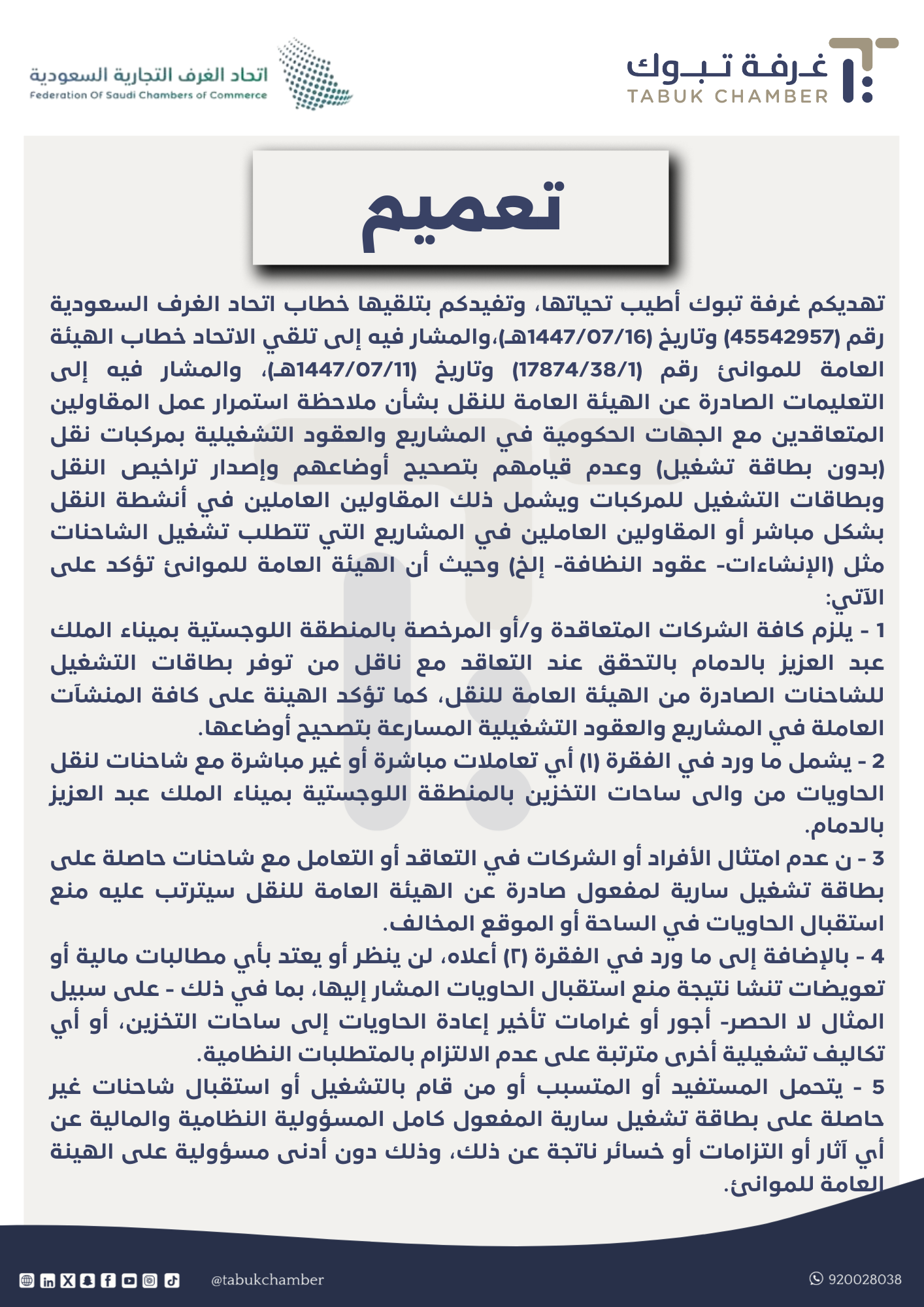 تهديكم غرفة تبوك أطيب تحياتها، وتفيدكم بتلقيها خطاب اتحاد الغرف السعودية رقم (45542957) وتاريخ (1447/07/16هـ)،والمشار فيه إلى تلقي الاتحاد خطاب الهيئة العامة للموانئ رقم (17874/38/1) وتاريخ (1447/07/11هـ)، والمشار فيه إلى التعليمات الصادرة عن الهيئة العامة للنقل بشأن ملاحظة استمرار عمل المقاولين المتعاقدين مع الجهات الحكومية في المشاريع والعقود التشغيلية بمركبات نقل (بدون بطاقة تشغيل) وعدم قيامهم بتصحيح أوضاعهم وإصدار تراخيص النقل وبطاقات التشغيل للمركبات ويشمل ذلك المقاولين العاملين في أنشطة النقل بشكل مباشر أو المقاولين العاملين في المشاريع التي تتطلب تشغيل الشاحنات مثل (الإنشاءات- عقود النظافة- إلخ) وحيث أن الهيئة العامة للموانئ تؤكد على الآتي: 1 - يلزم كافة الشركات المتعاقدة و/أو المرخصة بالمنطقة اللوجستية بميناء الملك عبد العزيز بالدمام بالتحقق عند التعاقد مع ناقل من توفر بطاقات التشغيل للشاحنات الصادرة من الهيئة العامة للنقل، كما تؤكد الهينة على كافة المنشآت العاملة في المشاريع والعقود التشغيلية المسارعة بتصحيح أوضاعها. 2 - يشمل ما ورد في الفقرة (١) أي تعاملات مباشرة أو غير مباشرة مع شاحنات لنقل الحاويات من والى ساحات التخزين بالمنطقة اللوجستية بميناء الملك عبد العزيز بالدمام. 3 - ن عدم امتثال الأفراد أو الشركات في التعاقد أو التعامل مع شاحنات حاصلة على بطاقة تشغيل سارية لمفعول صادرة عن الهيئة العامة للنقل سيترتب عليه منع استقبال الحاويات في الساحة أو الموقع المخالف. 4 - بالإضافة إلى ما ورد في الفقرة (٢) أعلاه، لن ينظر أو يعتد بأي مطالبات مالية أو تعويضات تنشا نتيجة منع استقبال الحاويات المشار إليها، بما في ذلك - على سبيل المثال لا الحصر- أجور أو غرامات تأخير إعادة الحاويات إلى ساحات التخزين، أو أي تكاليف تشغيلية أخرى مترتبة على عدم الالتزام بالمتطلبات النظامية. 5 - يتحمل المستفيد أو المتسبب أو من قام بالتشغيل أو استقبال شاحنات غير حاصلة على بطاقة تشغيل سارية المفعول كامل المسؤولية النظامية والمالية عن أي آثار أو التزامات أو خسائر ناتجة عن ذلك، وذلك دون أدنى مسؤولية على الهينة العامة للموانئ.