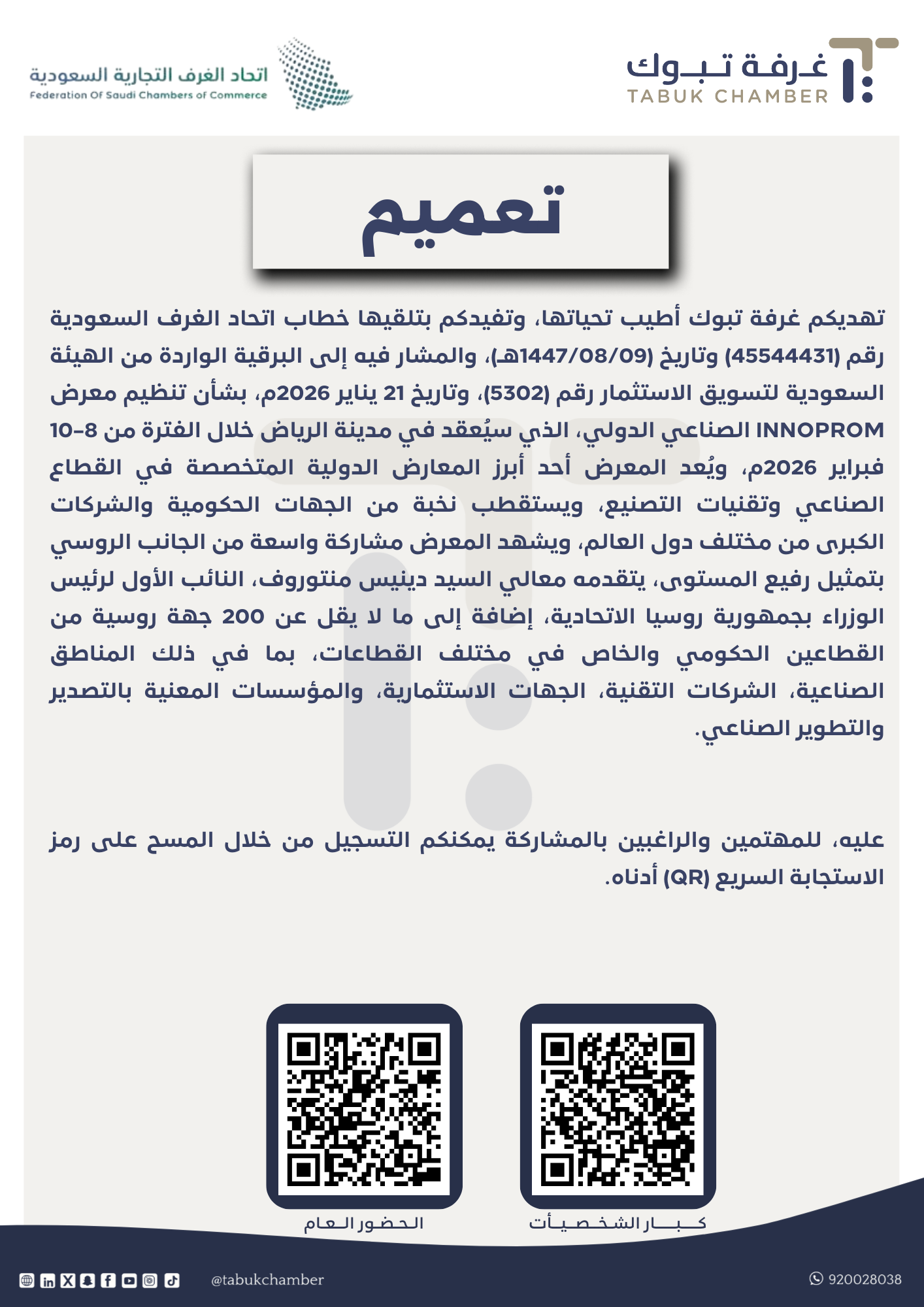 تهديكم غرفة تبوك أطيب تحياتها، وتفيدكم بتلقيها خطاب اتحاد الغرف السعودية رقم (45544431) وتاريخ (1447/08/09هـ)، والمشار فيه إلى البرقية الواردة من الهيئة السعودية لتسويق الاستثمار رقم (5302)، وتاريخ 21 يناير 2026م، بشأن تنظيم معرض INNOPROM الصناعي الدولي، الذي سيُعقد في مدينة الرياض خلال الفترة من 8–10 فبراير 2026م، ويُعد المعرض أحد أبرز المعارض الدولية المتخصصة في القطاع الصناعي وتقنيات التصنيع، ويستقطب نخبة من الجهات الحكومية والشركات الكبرى من مختلف دول العالم، ويشهد المعرض مشاركة واسعة من الجانب الروسي بتمثيل رفيع المستوى، يتقدمه معالي السيد دينيس منتوروف، النائب الأول لرئيس الوزراء بجمهورية روسيا الاتحادية، إضافة إلى ما لا يقل عن 200 جهة روسية من القطاعين الحكومي والخاص في مختلف القطاعات، بما في ذلك المناطق الصناعية، الشركات التقنية، الجهات الاستثمارية، والمؤسسات المعنية بالتصدير والتطوير الصناعي. عليه، للمهتمين والراغبين بالمشاركة يمكنكم التسجيل من خلال المسح على رمز الاستجابة السريع (QR) أدناه.