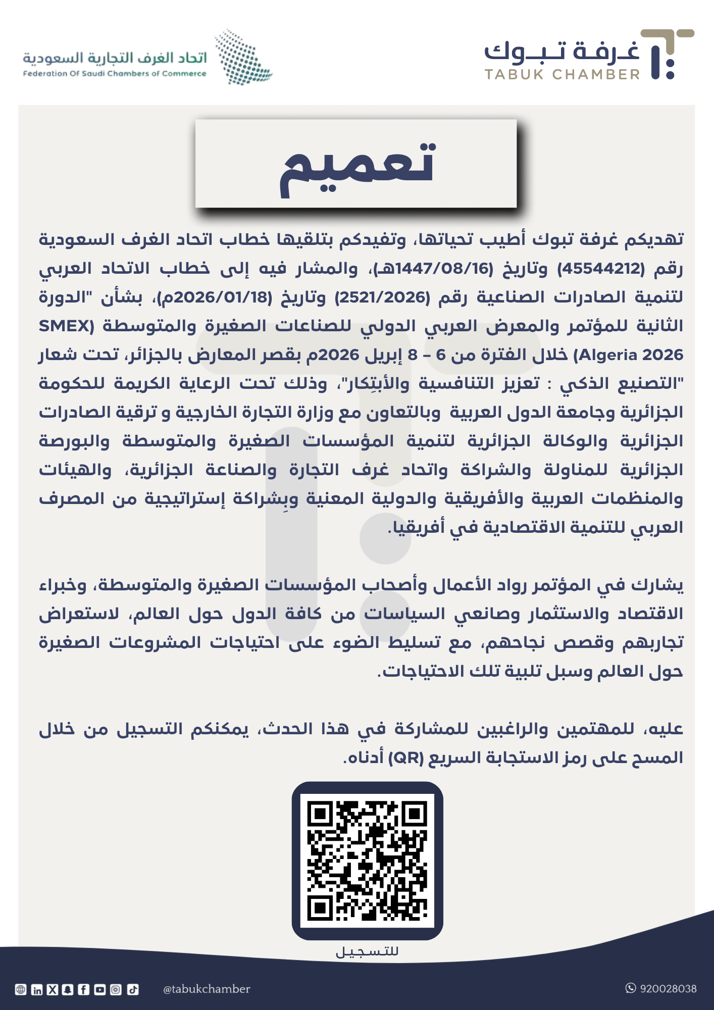 تهديكم غرفة تبوك أطيب تحياتها، وتفيدكم بتلقيها خطاب اتحاد الغرف السعودية رقم (45544212) وتاريخ (1447/08/16هـ)، والمشار فيه إلى خطاب الاتحاد العربي لتنمية الصادرات الصناعية رقم (2521/2026) وتاريخ (2026/01/18م)، بشأن "الدورة الثانية للمؤتمر والمعرض العربي الدولي للصناعات الصغيرة والمتوسطة (SMEX Algeria 2026) خلال الفترة من 6 – 8 إبريل 2026م بقصر المعارض بالجزائر، تحت شعار "التصنيع الذكي : تعزيز التنافسية والأبتِكار"، وذلك تحت الرعاية الكريمة للحكومة الجزائرية وجامعة الدول العربية وبالتعاون مع وزارة التجارة الخارجية و ترقية الصادرات الجزائرية والوكالة الجزائرية لتنمية المؤسسات الصغيرة والمتوسطة والبورصة الجزائرية للمناولة والشراكة واتحاد غرف التجارة والصناعة الجزائرية، والهيئات والمنظمات العربية والأفريقية والدولية المعنية وبِشراكة إستراتيجية من المصرف العربي للتنمية الاقتصادية في أفريقيا. يشارك في المؤتمر رواد الأعمال وأصحاب المؤسسات الصغيرة والمتوسطة، وخبراء الاقتصاد والاستثمار وصانعي السياسات من كافة الدول حول العالم، لاستعراض تجاربهم وقصص نجاحهم، مع تسليط الضوء على احتياجات المشروعات الصغيرة حول العالم وسبل تلبية تلك الاحتياجات عليه، للمهتمين والراغبين للمشاركة في هذا الحدث، يمكنكم التسجيل من خلال المسح على رمز الاستجابة السريع (QR) أدناه.