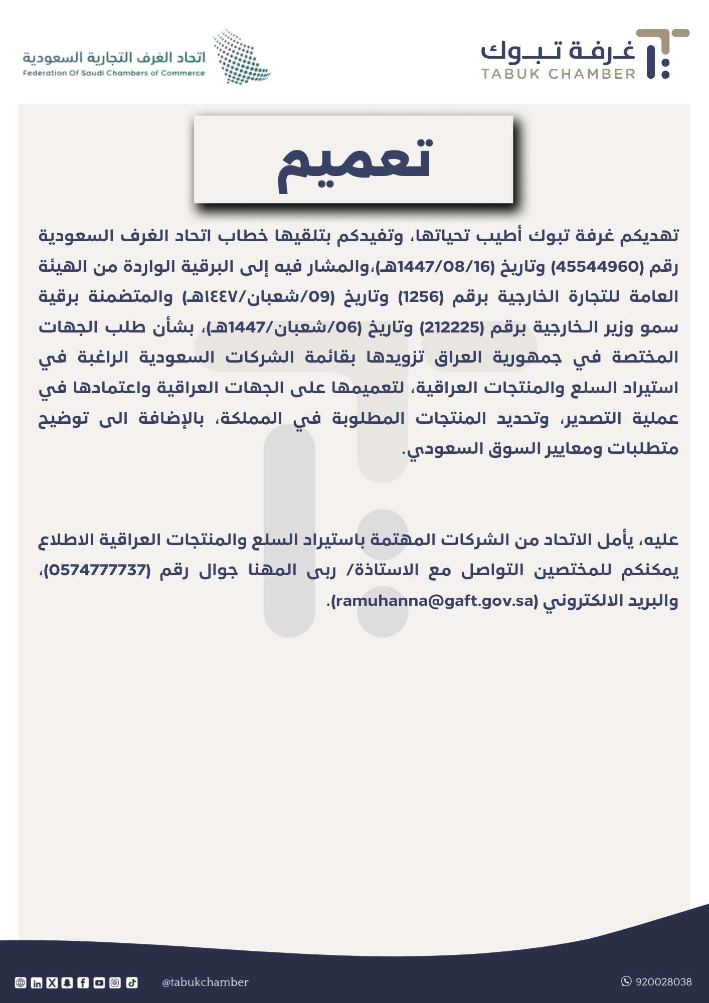 تهديكم غرفة تبوك أطيب تحياتها، وتفيدكم بتلقيها خطاب اتحاد الغرف السعودية رقم (45544960) وتاريخ (1447/08/16هـ)،والمشار فيه إلى البرقية الواردة من الهيئة العامة للتجارة الخارجية برقم (1256) وتاريخ (09/شعبان/١٤٤٧هـ) والمتضمنة برقية سمو وزير الـخارجية برقم (212225) وتاريخ (06/شعبان/1447هـ)، بشأن طلب الجهات المختصة في جمهورية العراق تزويدها بقائمة الشركات السعودية الراغبة في استيراد السلع والمنتجات العراقية، لتعميمها على الجهات العراقية واعتمادها في عملية التصدير، وتحديد المنتجات المطلوبة في المملكة، بالإضافة الى توضيح متطلبات ومعايير السوق السعودي. عليه، يأمل الاتحاد من الشركات المهتمة باستيراد السلع والمنتجات العراقية الاطلاع يمكنكم للمختصين التواصل مع الاستاذة/ ربى المهنا جوال رقم (0574777737)، والبريد الالكتروني (ramuhanna@gaft.gov.sa). -------------------------------------
