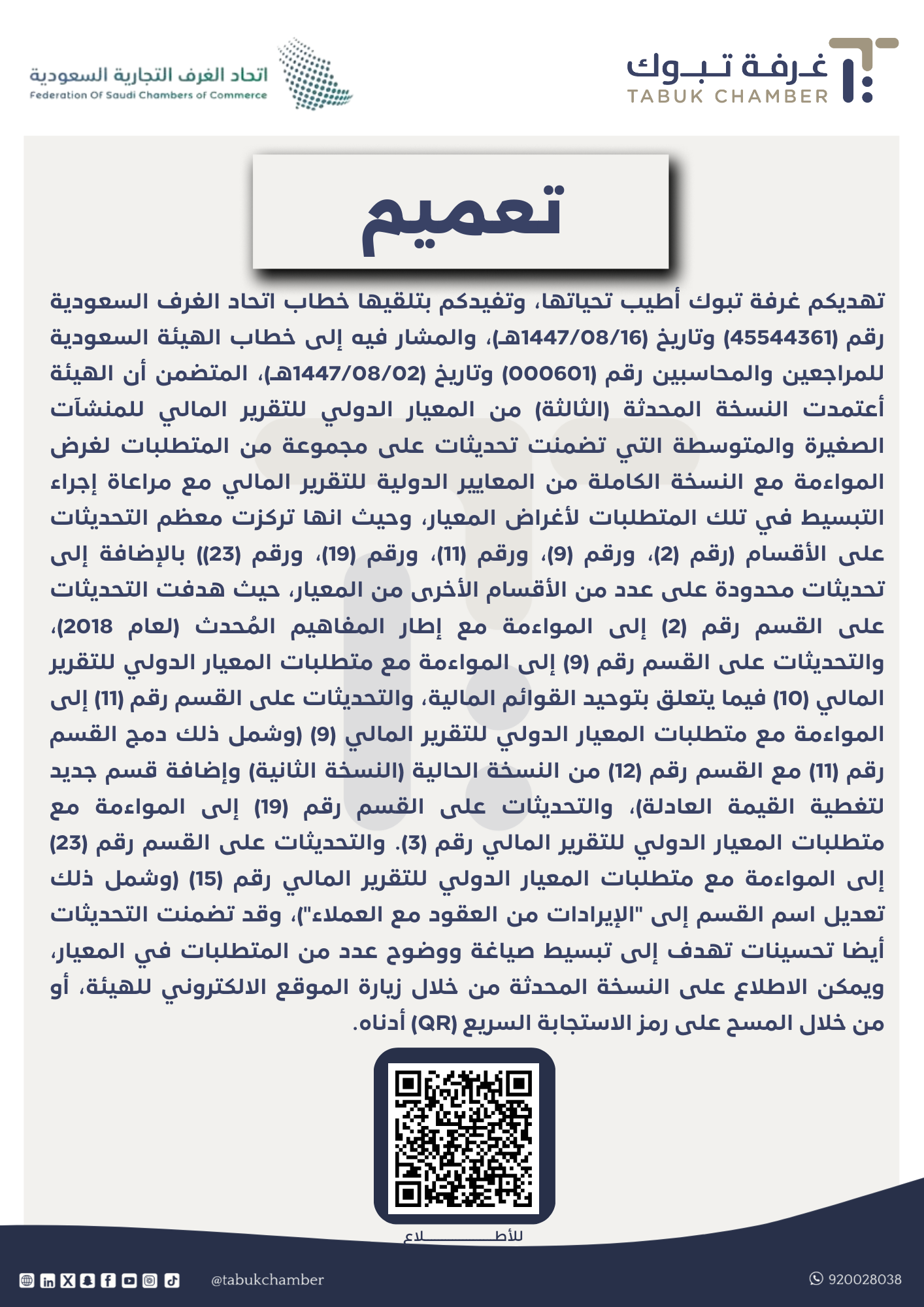 تهديكم غرفة تبوك أطيب تحياتها، وتفيدكم بتلقيها خطاب اتحاد الغرف السعودية رقم (45544361) وتاريخ (1447/08/16هـ)، والمشار فيه إلى خطاب الهيئة السعودية للمراجعين والمحاسبين رقم (000601) وتاريخ (1447/08/02هـ)، المتضمن أن الهيئة أعتمدت النسخة المحدثة (الثالثة) من المعيار الدولي للتقرير المالي للمنشآت الصغيرة والمتوسطة التي تضمنت تحديثات على مجموعة من المتطلبات لغرض المواءمة مع النسخة الكاملة من المعايير الدولية للتقرير المالي مع مراعاة إجراء التبسيط في تلك المتطلبات لأغراض المعيار، وحيث انها تركزت معظم التحديثات على الأقسام (رقم (2)، ورقم (9)، ورقم (11)، ورقم (19)، ورقم (23)) بالإضافة إلى تحديثات محدودة على عدد من الأقسام الأخرى من المعيار، حيث هدفت التحديثات على القسم رقم (2) إلى المواءمة مع إطار المفاهيم المُحدث (لعام 2018)، والتحديثات على القسم رقم (9) إلى المواءمة مع متطلبات المعيار الدولي للتقرير المالي (10) فيما يتعلق بتوحيد القوائم المالية، والتحديثات على القسم رقم (11) إلى المواءمة مع متطلبات المعيار الدولي للتقرير المالي (9) (وشمل ذلك دمج القسم رقم (11) مع القسم رقم (12) من النسخة الحالية (النسخة الثانية) وإضافة قسم جديد لتغطية القيمة العادلة)، والتحديثات على القسم رقم (19) إلى المواءمة مع متطلبات المعيار الدولي للتقرير المالي رقم (3). والتحديثات على القسم رقم (23) إلى المواءمة مع متطلبات المعيار الدولي للتقرير المالي رقم (15) (وشمل ذلك تعديل اسم القسم إلى "الإيرادات من العقود مع العملاء")، وقد تضمنت التحديثات أيضا تحسينات تهدف إلى تبسيط صياغة ووضوح عدد من المتطلبات في المعيار، ويمكن الاطلاع على النسخة المحدثة من خلال زيارة الموقع الالكتروني للهيئة، أو من خلال المسح على رمز الاستجابة السريع (QR) أدناه.