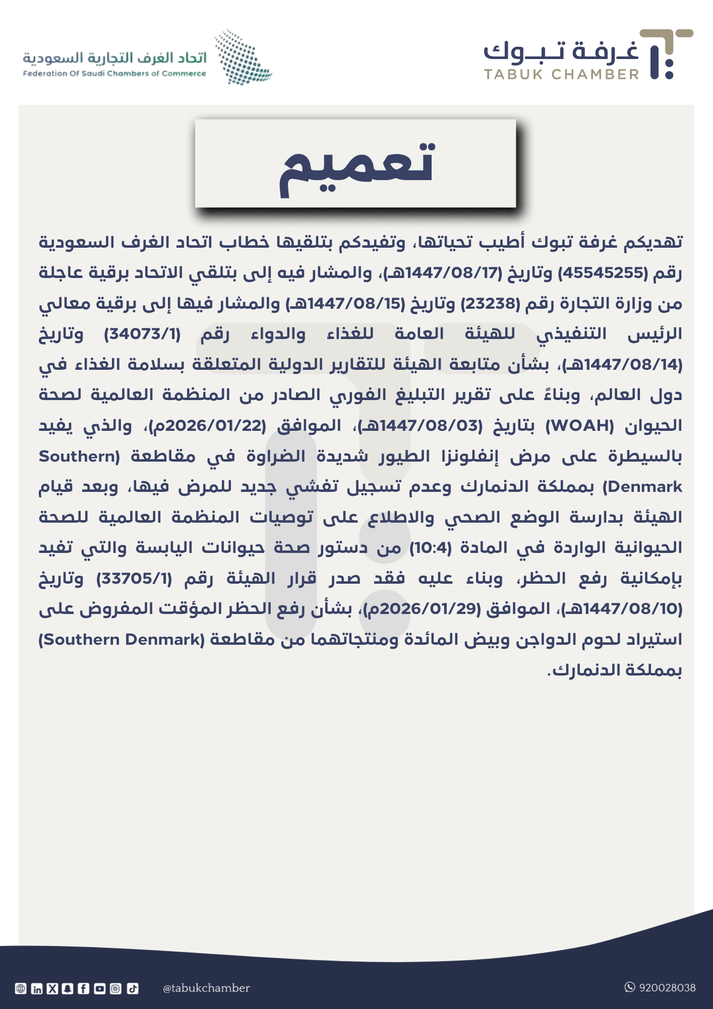 تهديكم غرفة تبوك أطيب تحياتها، وتفيدكم بتلقيها خطاب اتحاد الغرف السعودية رقم (45545255) وتاريخ (1447/08/17هـ)، والمشار فيه إلى بتلقي الاتحاد برقية عاجلة من وزارة التجارة رقم (23238) وتاريخ (1447/08/15هـ) والمشار فيها إلى برقية معالي الرئيس التنفيذي للهيئة العامة للغذاء والدواء رقم (34073/1) وتاريخ (1447/08/14هـ)، بشأن متابعة الهيئة للتقارير الدولية المتعلقة بسلامة الغذاء في دول العالم، وبناءً على تقرير التبليغ الفوري الصادر من المنظمة العالمية لصحة الحيوان (WOAH) بتاريخ (1447/08/03هـ)، الموافق (2026/01/22م)، والذي يفيد بالسيطرة على مرض إنفلونزا الطيور شديدة الضراوة في مقاطعة (Southern Denmark) بمملكة الدنمارك وعدم تسجيل تفشي جديد للمرض فيها، وبعد قيام الهيئة بدارسة الوضع الصحي والاطلاع على توصيات المنظمة العالمية للصحة الحيوانية الواردة في المادة (10:4) من دستور صحة حيوانات اليابسة والتي تفيد بإمكانية رفع الحظر، وبناء عليه فقد صدر قرار الهيئة رقم (33705/1) وتاريخ (1447/08/10هـ)، الموافق (2026/01/29م)، بشأن رفع الحظر المؤقت المفروض على استيراد لحوم الدواجن وبيض المائدة ومنتجاتهما من مقاطعة (Southern Denmark) بمملكة الدنمارك.