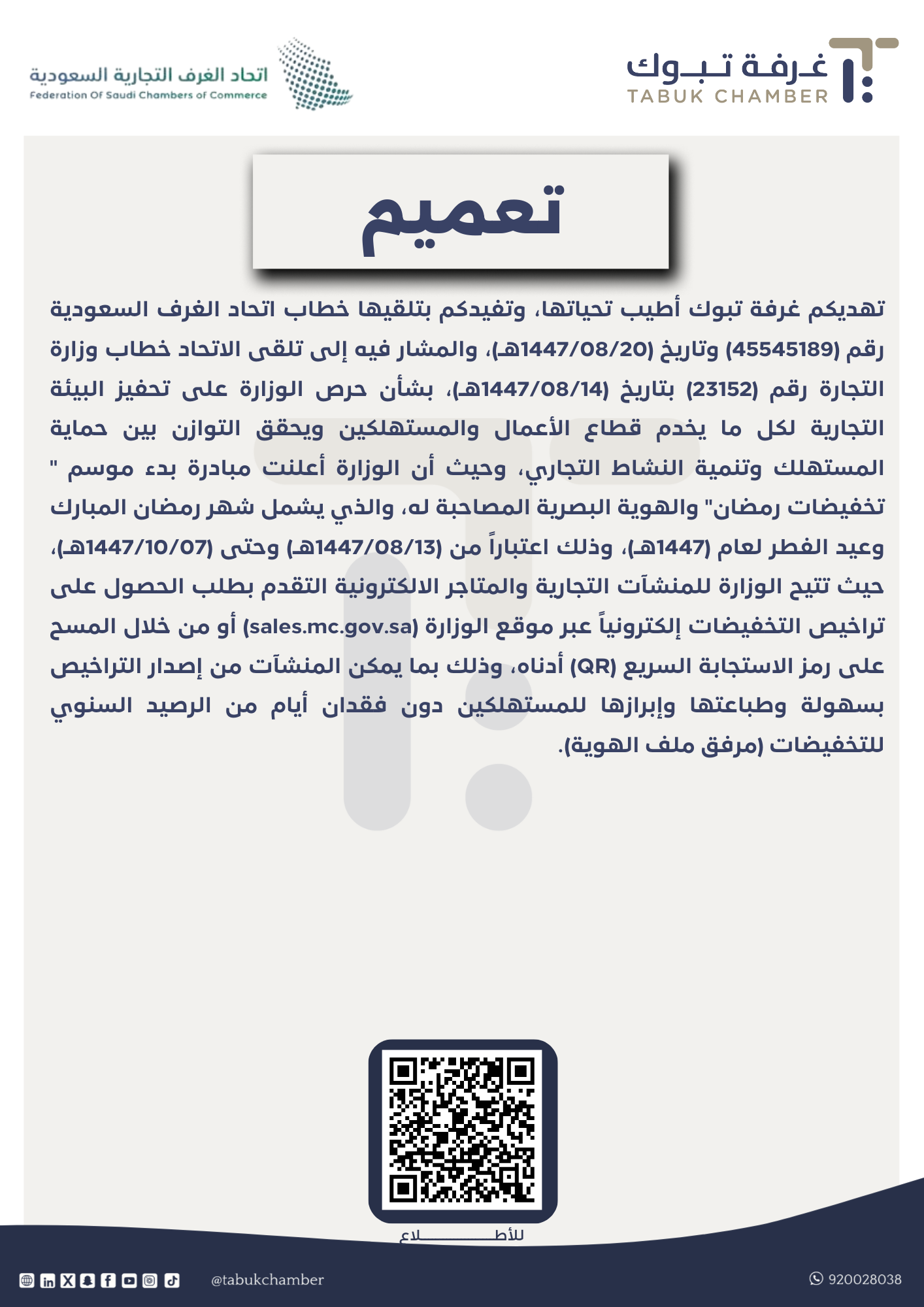 تهديكم غرفة تبوك أطيب تحياتها، وتفيدكم بتلقيها خطاب اتحاد الغرف السعودية رقم (45545189) وتاريخ (1447/08/20هـ)، والمشار فيه إلى تلقى الاتحاد خطاب وزارة التجارة رقم (23152) بتاريخ (1447/08/14هـ)، بشأن حرص الوزارة على تحفيز البيئة التجارية لكل ما يخدم قطاع الأعمال والمستهلكين ويحقق التوازن بين حماية المستهلك وتنمية النشاط التجاري، وحيث أن الوزارة أعلنت مبادرة بدء موسم " تخفيضات رمضان" والهوية البصرية المصاحبة له، والذي يشمل شهر رمضان المبارك وعيد الفطر لعام (1447هـ)، وذلك اعتباراً من (1447/08/13هـ) وحتى (1447/10/07هـ)، حيث تتيح الوزارة للمنشآت التجارية والمتاجر الالكترونية التقدم بطلب الحصول على تراخيص التخفيضات إلكترونياً عبر موقع الوزارة (sales.mc.gov.sa) أو من خلال المسح على رمز الاستجابة السريع (QR) أدناه، وذلك بما يمكن المنشآت من إصدار التراخيص بسهولة وطباعتها وإبرازها للمستهلكين دون فقدان أيام من الرصيد السنوي للتخفيضات (مرفق ملف الهوية).