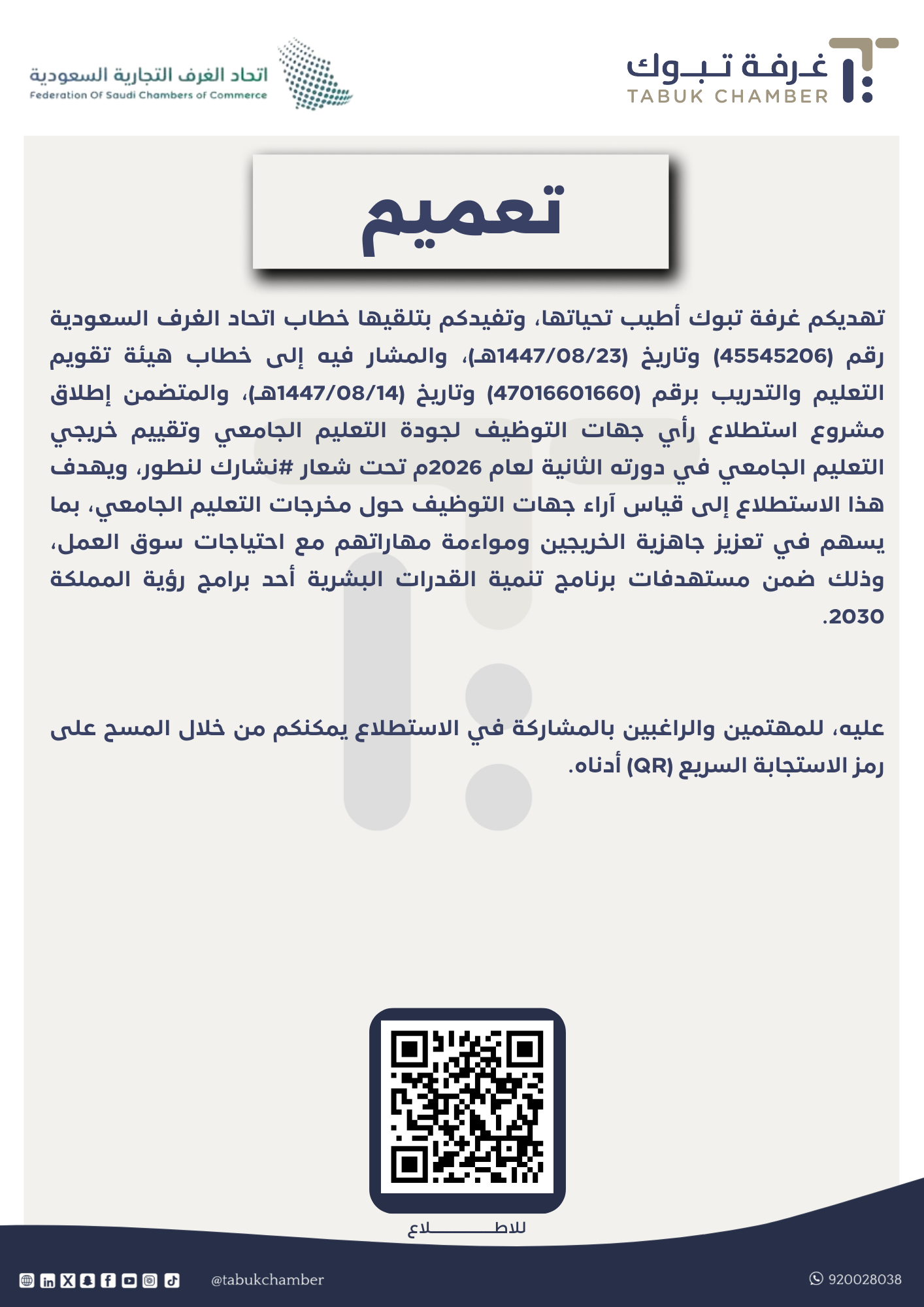 تهديكم غرفة تبوك أطيب تحياتها، وتفيدكم بتلقيها خطاب اتحاد الغرف السعودية رقم (45545206) وتاريخ (1447/08/23هـ)، والمشار فيه إلى خطاب هيئة تقويم التعليم والتدريب برقم (47016601660) وتاريخ (1447/08/14هـ)، والمتضمن إطلاق مشروع استطلاع رأي جهات التوظيف لجودة التعليم الجامعي وتقييم خريجي التعليم الجامعي في دورته الثانية لعام 2026م تحت شعار #نشارك لنطور، ويهدف هذا الاستطلاع إلى قياس آراء جهات التوظيف حول مخرجات التعليم الجامعي، بما يسهم في تعزيز جاهزية الخريجين ومواءمة مهاراتهم مع احتياجات سوق العمل، وذلك ضمن مستهدفات برنامج تنمية القدرات البشرية أحد برامج رؤية المملكة 2030. عليه، للمهتمين والراغبين بالمشاركة في الاستطلاع يمكنكم من خلال المسح على رمز الاستجابة السريع (QR) أدناه.