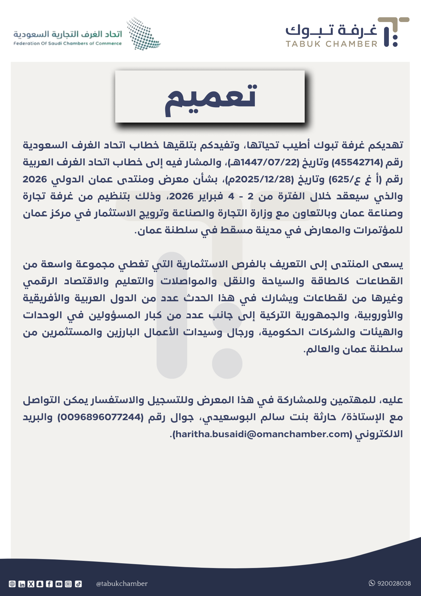 تهديكم غرفة تبوك أطيب تحياتها، وتفيدكم بتلقيها خطاب اتحاد الغرف السعودية رقم (45542714) وتاريخ (1447/07/22هـ)، والمشار فيه إلى خطاب اتحاد الغرف العربية رقم (أغ ع/625) وتاريخ (2025/12/28م)، بشأن معرض ومنتدى عمان الدولي 2026 والذي سيعقد خلال الفترة من 2 - 4 فبراير 2026، وذلك بتنظيم من غرفة تجارة وصناعة عمان وبالتعاون مع وزارة التجارة والصناعة وترويج الاستثمار في مركز عمان للمؤتمرات والمعارض في مدينة مسقط في سلطنة عمان. يسعى المنتدى إلى التعريف بالفرص الاستثمارية التي تغطي مجموعة واسعة من القطاعات كالطاقة والسياحة والنقل والمواصلات والتعليم والاقتصاد الرقمي وغيرها من لقطاعات ويشارك في هذا الحدث عدد من الدول العربية والأفريقية والأوروبية، والجمهورية التركية إلى جانب عدد من كبار المسؤولين في الوحدات والهيئات والشركات الحكومية، ورجال وسيدات الأعمال البارزين والمستثمرين من سلطنة عمان والعالم. عليه، للمهتمين وللمشاركة في هذا المعرض وللتسجيل والاستفسار يمكن التواصل مع الإستاذة/ حارثة بنت سالم البوسعيدي، جوال رقم (0096896077244) والبريد الالكتروني (haritha.busaidi@omanchamber.com).