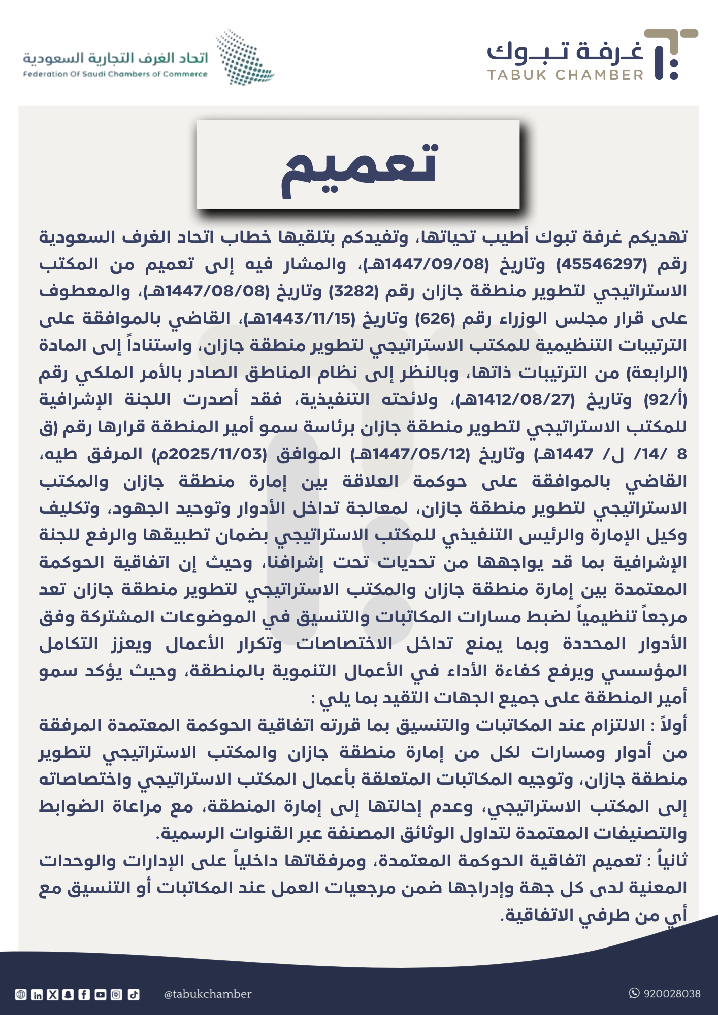 تهديكم غرفة تبوك أطيب تحياتها، وتفيدكم بتلقيها خطاب اتحاد الغرف السعودية رقم (45546297) وتاريخ (1447/09/08هـ)، والمشار فيه إلى تميم من المكتب الاستراتيجي لتطوير منطقة جازان رقم (3282) وتاريخ (1447/08/08هـ)، والمعطوف على قرار مجلس الوزراء رقم (626) وتاريخ (1443/11/15هـ)، القاضي بالموافقة على الترتيبات التنظيمية للمكتب الاستراتيجي لتطوير منطقة جازان، واستناداً إلى المادة (الرابعة) من الترتيبات ذاتها، وبالنظر إلى نظام المناطق الصادر بالأمر الملكي رقم (أ/92) وتاريخ (1412/08/27هـ)، ولائحته التنفيذية، فقد أصدرت اللجنة الإشرافية للمكتب الاستراتيجي لتطوير منطقة جازان برئاسة سمو أمير المنطقة قرارها رقم (ق 8 /14/ ل/ 1447هـ) وتاريخ (1447/05/12هـ) الموافق (2025/11/03م) المرفق طيه، القاضي بالموافقة على حوكمة العلاقة بين إمارة منطقة جازان والمكتب الاستراتيجي لتطوير منطقة جازان، لمعالجة تداخل الأدوار وتوحيد الجهود، وتكليف وكيل الإمارة والرئيس التنفيذي للمكتب الاستراتيجي بضمان تطبيقها والرفع للجنة الإشرافية بما قد يواجهها من تحديات تحت إشرافنا، وحيث إن اتفاقية الحوكمة المعتمدة بين إمارة منطقة جازان والمكتب الاستراتيجي لتطوير منطقة جازان تعد مرجعاً تنظيمياً لضبط مسارات المكاتبات والتنسيق في الموضوعات المشتركة وفق الأدوار المحددة وبما يمنع تداخل الاختصاصات وتكرار الأعمال ويعزز التكامل المؤسسي ويرفع كفاءة الأداء في الأعمال التنموية بالمنطقة، وحيث يؤكد سمو أمير المنطقة على جميع الجهات التقيد بما يلي : أولاً : الالتزام عند المكاتبات والتنسيق بما قررته اتفاقية الحوكمة المعتمدة المرفقة من أدوار ومسارات لكل من إمارة منطقة جازان والمكتب الاستراتيجي لتطوير منطقة جازان، وتوجيه المكاتبات المتعلقة بأعمال المكتب الاستراتيجي واختصاصاته إلى المكتب الاستراتيجي، وعدم إحالتها إلى إمارة المنطقة، مع مراعاة الضوابط والتصنيفات المعتمدة لتداول الوثائق المصنفة عبر القنوات الرسمية. ثانياُ : تعميم اتفاقية الحوكمة المعتمدة، ومرفقاتها داخلياً على الإدارات والوحدات المعنية لدى كل جهة وإدراجها ضمن مرجعيات العمل عند المكاتبات أو التنسيق مع أي من طرفي الاتفاقية.